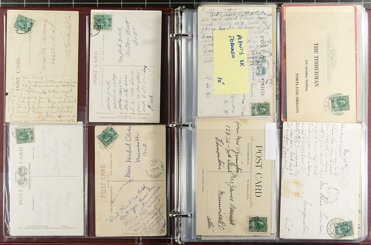 Admiral Postal History / Postcard Accumulation Part 1. A collector's journey of collecting Admiral franked postcards. This portion consists of two full binders, with 395 postcards, all selected for George V Admiral frankings and cancelled with CDS postmarks from across the country. Displayed on clear 4-pocket pages, all pages (except the first) arranged with 8 cards per-page, with the postally used side showing outwards. An excellent opportunity for the postmark or Admiral hound, with 4 large lots offered in this sale. Estimate =