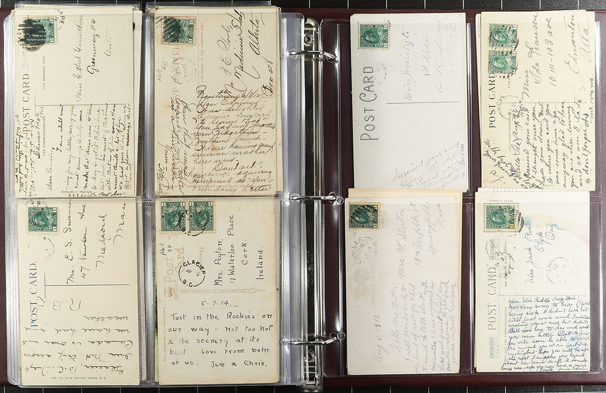 Admiral Postal History / Postcard Accumulation Part 2. A collector's journey of collecting Admiral franked postcards. This portion consists of two full binders, with 367 postcards, all selected for George V Admiral frankings and cancelled with SPLIT RING postmarks from across the country. Displayed on clear 4-pocket pages, all pages (except the first) arranged with 8 cards per-page, with the postally used side showing outwards. An excellent opportunity for the postmark or Admiral hound, with 4 large lots offered in this sale. Estimate =