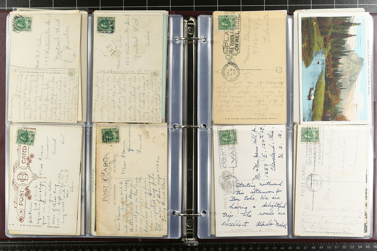 Admiral Postal History / Postcard Accumulation Part 3. A collector's journey of collecting Admiral franked postcards. This portion consists of three full binders, with 667 postcards, all selected for George V Admiral frankings and cancelled with SLOGAN postmarks from across the country. Displayed on clear 4-pocket pages, all pages (except the first) arranged with 8 cards per-page, with the postally used side showing outwards. An excellent opportunity for the postmark or Admiral hound, with 4 large lots offered in this sale. Estimate =