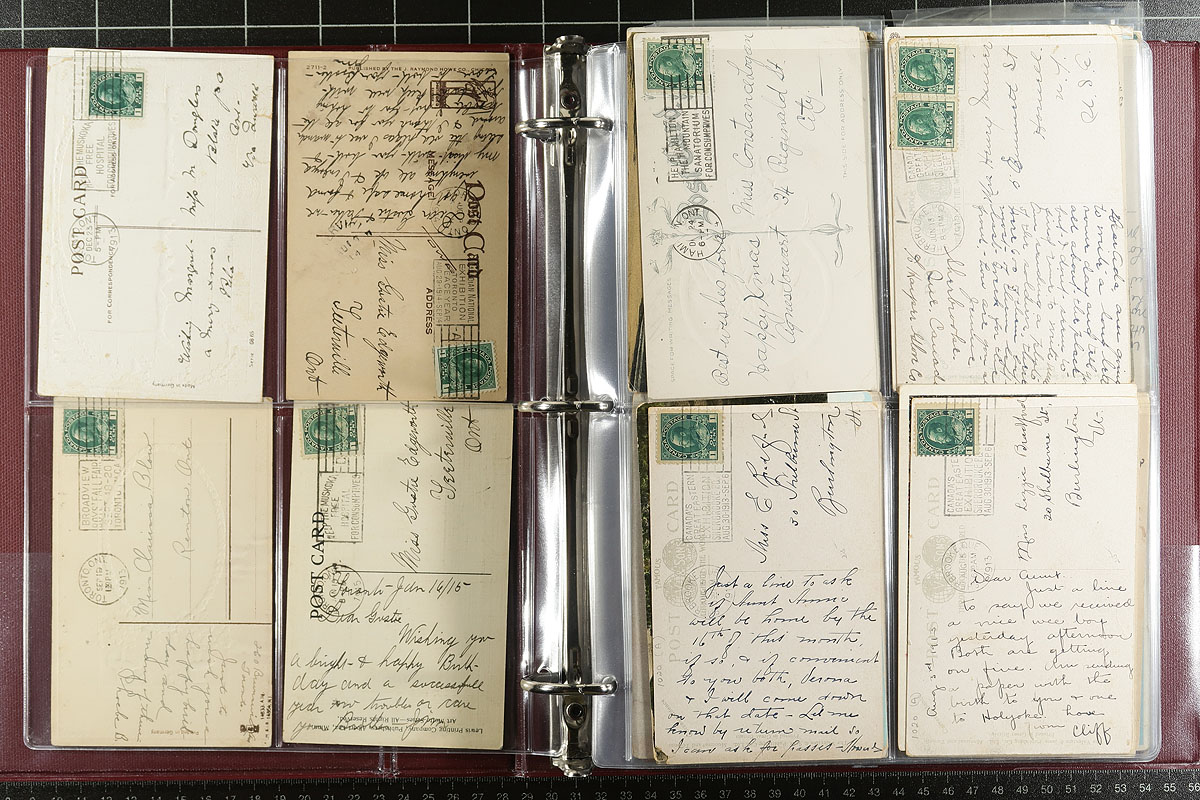 Admiral Postal History / Postcard Accumulation Part 3. A collector's journey of collecting Admiral franked postcards. This portion consists of three full binders, with 667 postcards, all selected for George V Admiral frankings and cancelled with SLOGAN postmarks from across the country. Displayed on clear 4-pocket pages, all pages (except the first) arranged with 8 cards per-page, with the postally used side showing outwards. An excellent opportunity for the postmark or Admiral hound, with 4 large lots offered in this sale. Estimate =