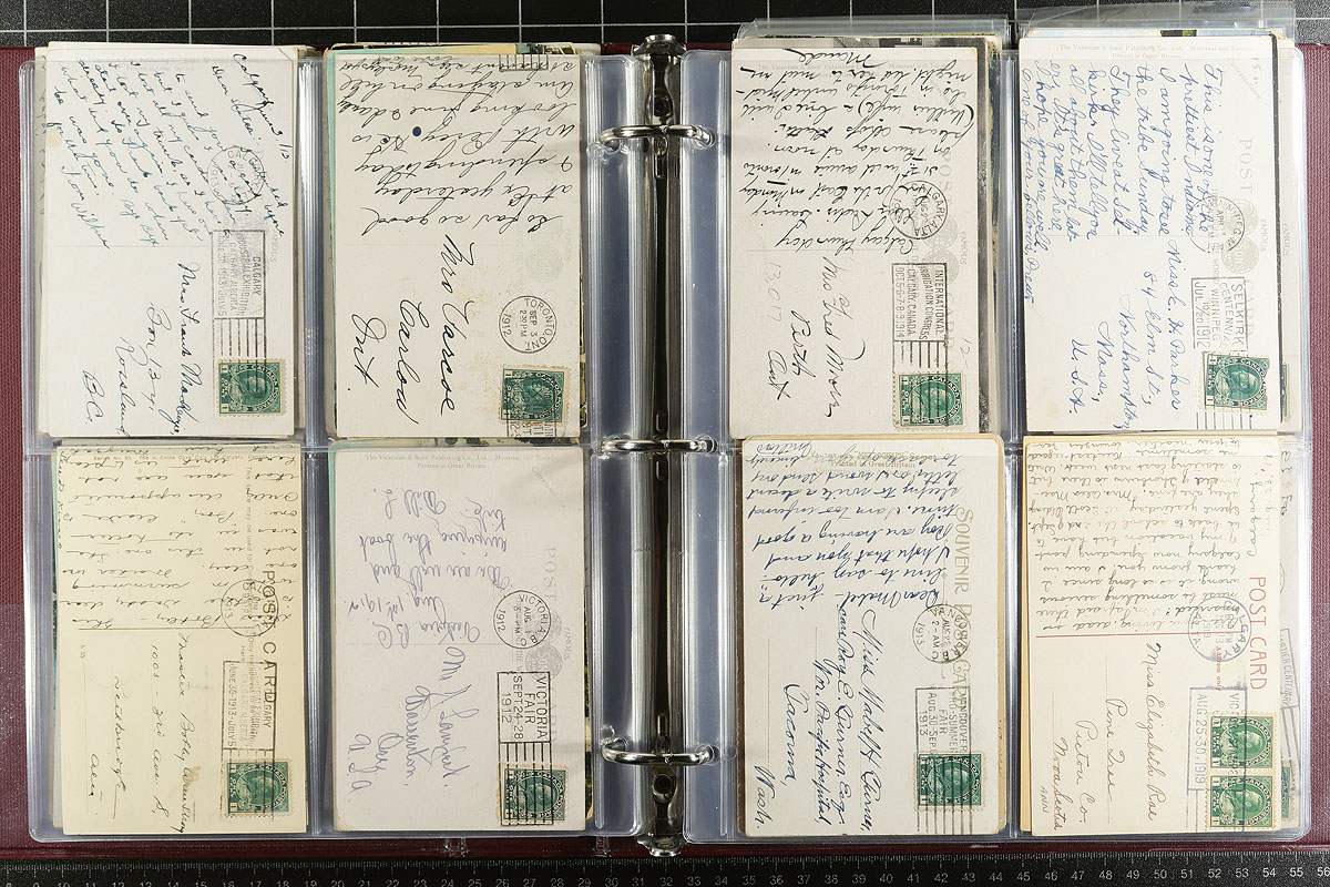 Admiral Postal History / Postcard Accumulation Part 3. A collector's journey of collecting Admiral franked postcards. This portion consists of three full binders, with 667 postcards, all selected for George V Admiral frankings and cancelled with SLOGAN postmarks from across the country. Displayed on clear 4-pocket pages, all pages (except the first) arranged with 8 cards per-page, with the postally used side showing outwards. An excellent opportunity for the postmark or Admiral hound, with 4 large lots offered in this sale. Estimate =