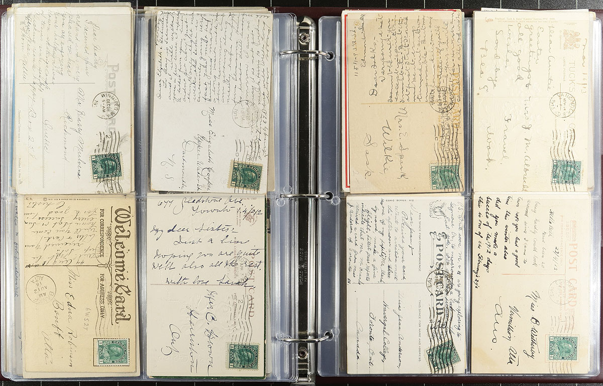 Admiral Postal History / Postcard Accumulation Part 4. A collector's journey of collecting Admiral franked postcards. This portion consists of two full binders, with 534 postcards, all selected for George V Admiral frankings and cancelled with MACHINE postmarks from across the country. A great opportunity for research here, as these machine cancels of the Admiral period are gaining traction in the postal history world, as "finds" can often be hiding in plain sight with new early / late dates. Displayed on clear 4-pocket pages, all pages (except the first) arranged with 8 cards per-page, with the postally used side showing outwards. An excellent opportunity for the postmark or Admiral hound, with 4 large lots offered in this sale. Estimate =