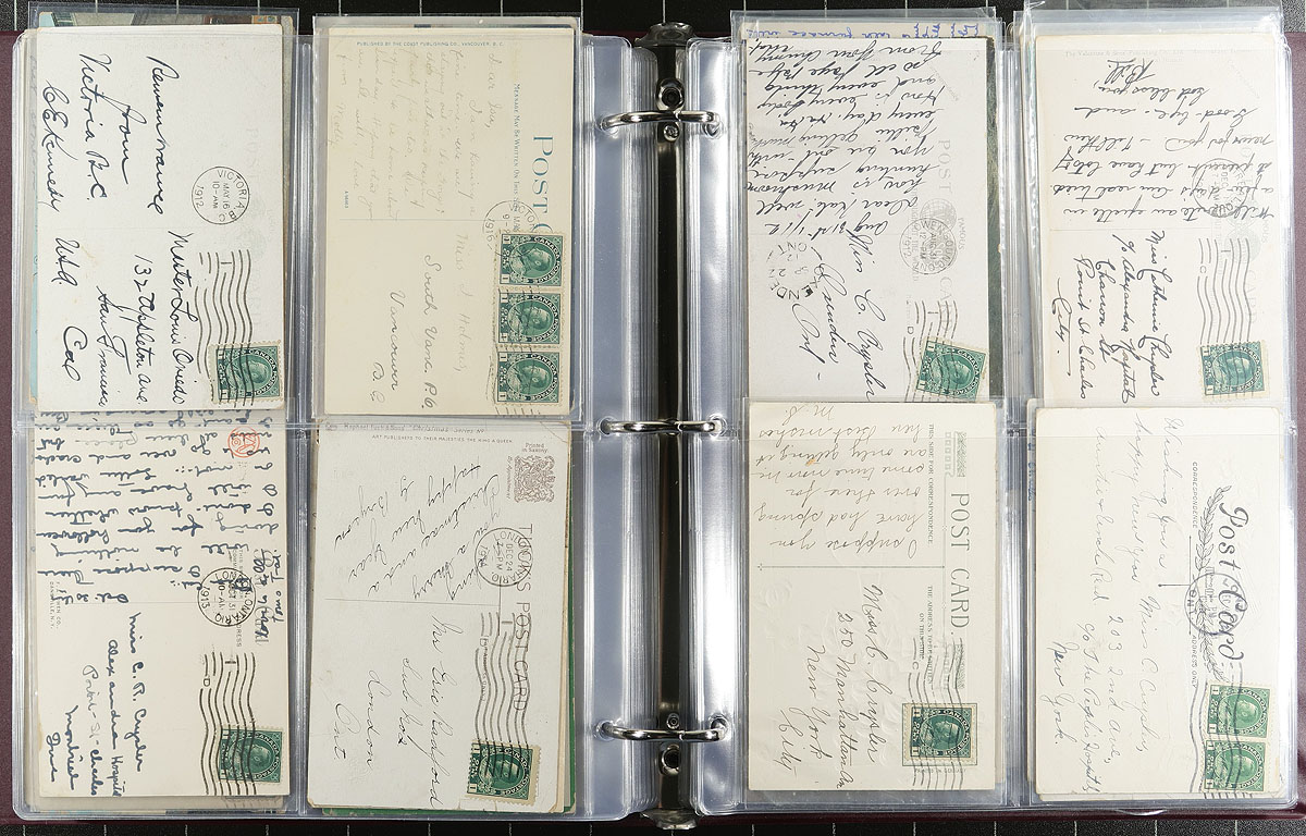 Admiral Postal History / Postcard Accumulation Part 4. A collector's journey of collecting Admiral franked postcards. This portion consists of two full binders, with 534 postcards, all selected for George V Admiral frankings and cancelled with MACHINE postmarks from across the country. A great opportunity for research here, as these machine cancels of the Admiral period are gaining traction in the postal history world, as "finds" can often be hiding in plain sight with new early / late dates. Displayed on clear 4-pocket pages, all pages (except the first) arranged with 8 cards per-page, with the postally used side showing outwards. An excellent opportunity for the postmark or Admiral hound, with 4 large lots offered in this sale. Estimate =