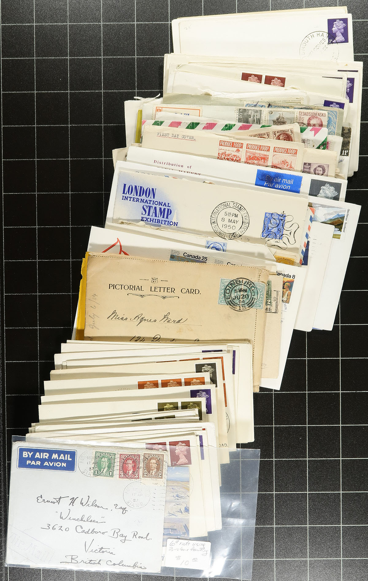 Bankers Box # 1. A hoard of roughly 1,500 worldwide covers and postcards, generally ranging from early to modern, containing a bit of everything from across the globe, offered as received. We note a mix of both commercial mail and first day covers or commemorative covers, along with picture postcards, rates, postal stationery, corner cards, etc. A nice lot with much to offer and would make great "dollar bin" stock. The first of three boxes, all offered in this sale. Estimate =