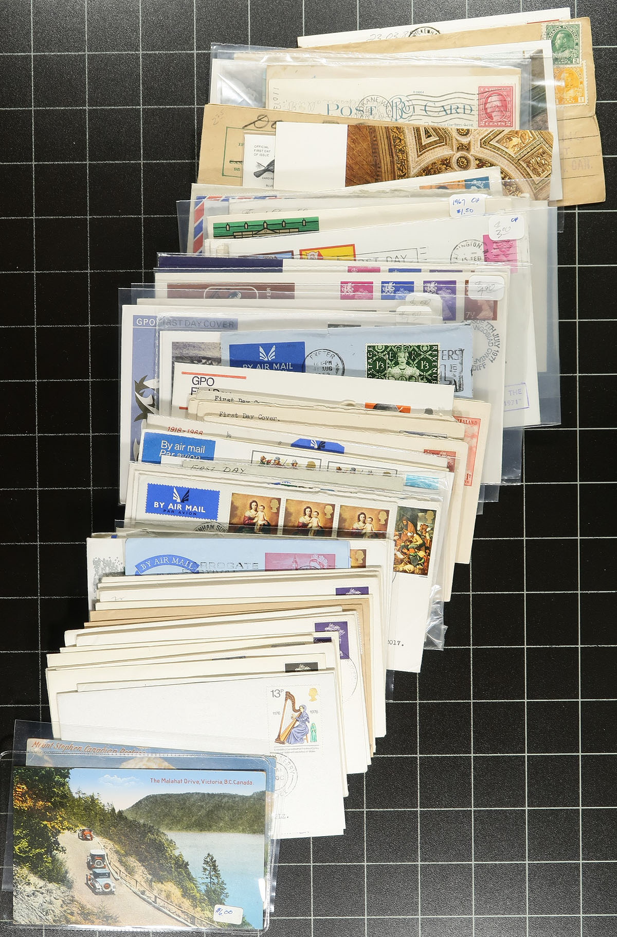 Bankers Box # 1. A hoard of roughly 1,500 worldwide covers and postcards, generally ranging from early to modern, containing a bit of everything from across the globe, offered as received. We note a mix of both commercial mail and first day covers or commemorative covers, along with picture postcards, rates, postal stationery, corner cards, etc. A nice lot with much to offer and would make great "dollar bin" stock. The first of three boxes, all offered in this sale. Estimate =