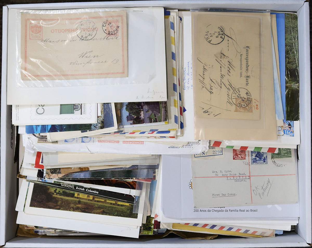 Bankers Box # 3. A hoard of roughly 1,500 worldwide covers and postcards, generally ranging from early to modern, containing a bit of everything from across the globe, offered as received. We note a mix of both commercial mail and first day covers or commemorative covers, along with picture postcards, rates, postal stationery, corner cards, etc. A nice lot with much to offer and would make great "dollar bin" stock. The third and final box of this consignment, all offered in this sale. Estimate =