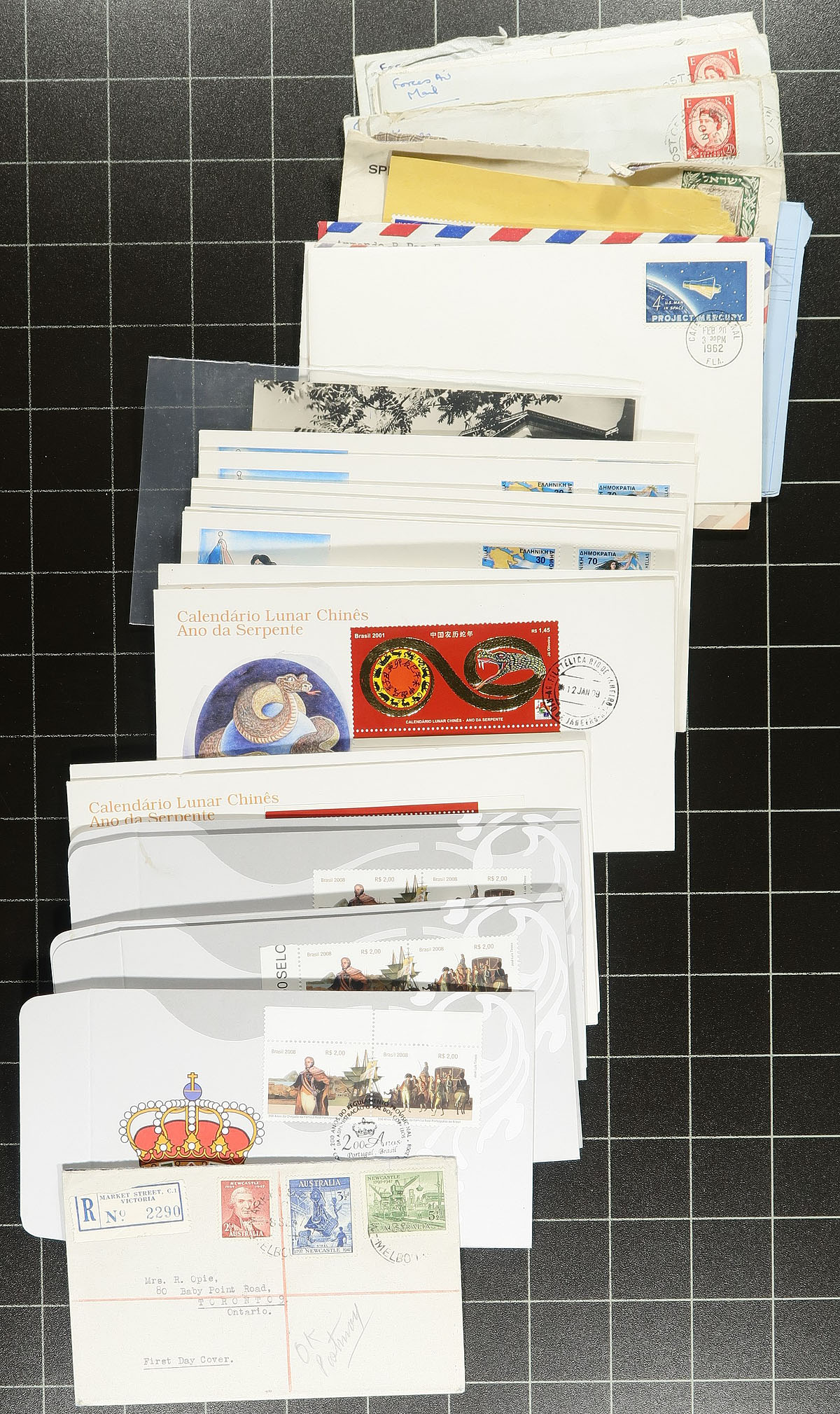 Bankers Box # 3. A hoard of roughly 1,500 worldwide covers and postcards, generally ranging from early to modern, containing a bit of everything from across the globe, offered as received. We note a mix of both commercial mail and first day covers or commemorative covers, along with picture postcards, rates, postal stationery, corner cards, etc. A nice lot with much to offer and would make great "dollar bin" stock. The third and final box of this consignment, all offered in this sale. Estimate =