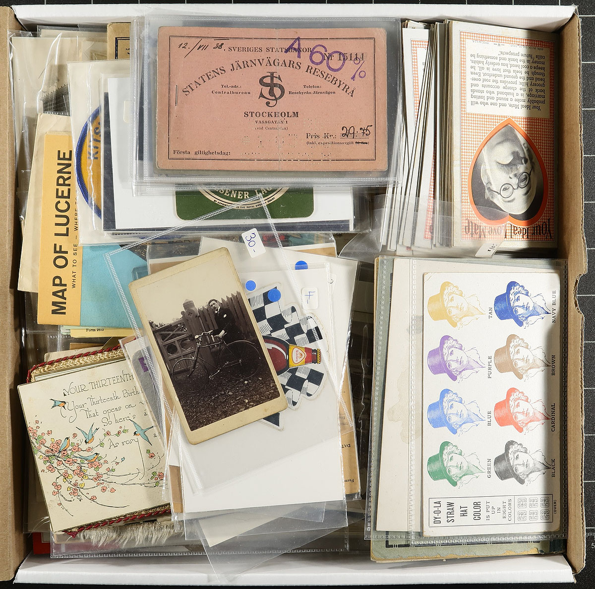 A "pizza box" of diverse mostly non-postal related ephemera, from a local estate. Includes (among other things), Prime Minister prints, several large photographs (including 5th Regiment Band WWI Victoria), Victoria BC "Tone Test Recital" programme (1921), Waldo BC 1923 School Roll of Honor certificate, letterheads, ship menus, photo negatives, early advertising cards, a stack of "Your Ideal Love Mate" cards (from an early amusement machine?), maps, greeting cards (AND MUCH MORE). Take a good look at the pictures to appreciate the scope of the group. Lots of value here if sorted out and individually sold. Estimate =