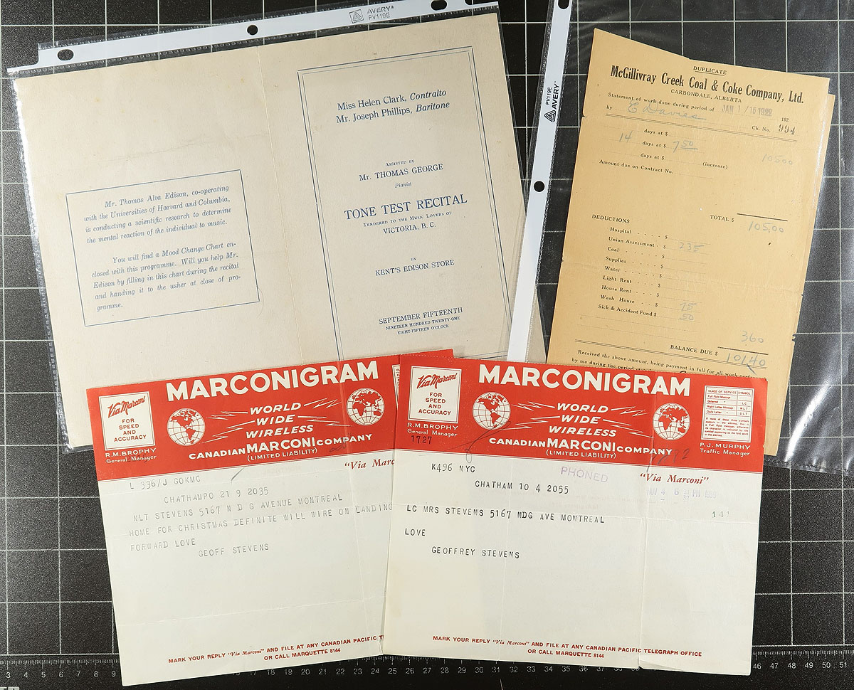 A "pizza box" of diverse mostly non-postal related ephemera, from a local estate. Includes (among other things), Prime Minister prints, several large photographs (including 5th Regiment Band WWI Victoria), Victoria BC "Tone Test Recital" programme (1921), Waldo BC 1923 School Roll of Honor certificate, letterheads, ship menus, photo negatives, early advertising cards, a stack of "Your Ideal Love Mate" cards (from an early amusement machine?), maps, greeting cards (AND MUCH MORE). Take a good look at the pictures to appreciate the scope of the group. Lots of value here if sorted out and individually sold. Estimate =