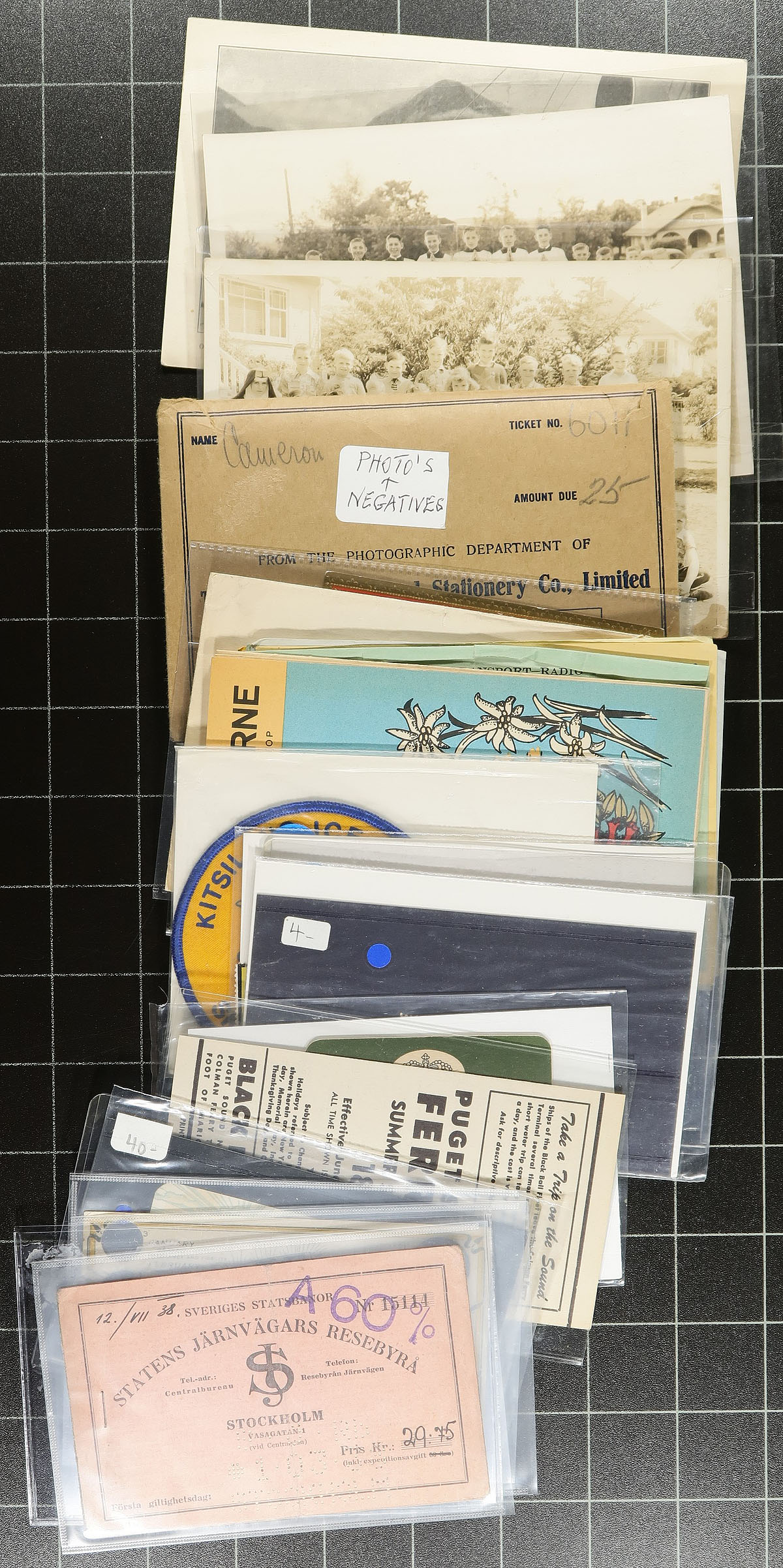 A "pizza box" of diverse mostly non-postal related ephemera, from a local estate. Includes (among other things), Prime Minister prints, several large photographs (including 5th Regiment Band WWI Victoria), Victoria BC "Tone Test Recital" programme (1921), Waldo BC 1923 School Roll of Honor certificate, letterheads, ship menus, photo negatives, early advertising cards, a stack of "Your Ideal Love Mate" cards (from an early amusement machine?), maps, greeting cards (AND MUCH MORE). Take a good look at the pictures to appreciate the scope of the group. Lots of value here if sorted out and individually sold. Estimate =