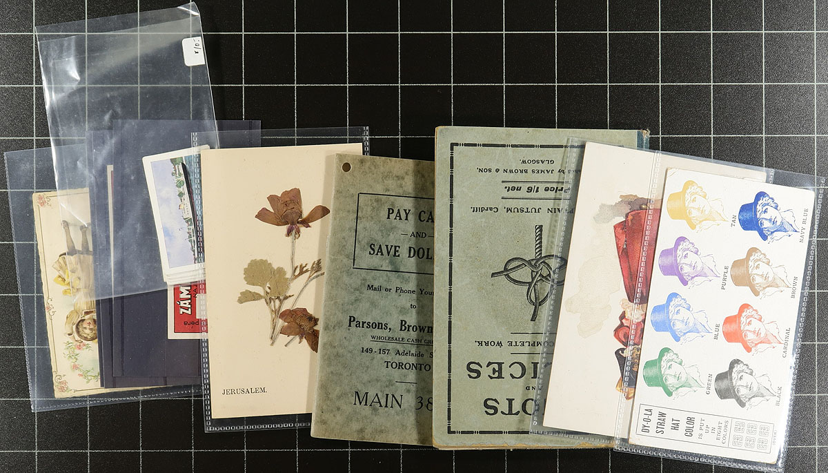 A "pizza box" of diverse mostly non-postal related ephemera, from a local estate. Includes (among other things), Prime Minister prints, several large photographs (including 5th Regiment Band WWI Victoria), Victoria BC "Tone Test Recital" programme (1921), Waldo BC 1923 School Roll of Honor certificate, letterheads, ship menus, photo negatives, early advertising cards, a stack of "Your Ideal Love Mate" cards (from an early amusement machine?), maps, greeting cards (AND MUCH MORE). Take a good look at the pictures to appreciate the scope of the group. Lots of value here if sorted out and individually sold. Estimate =