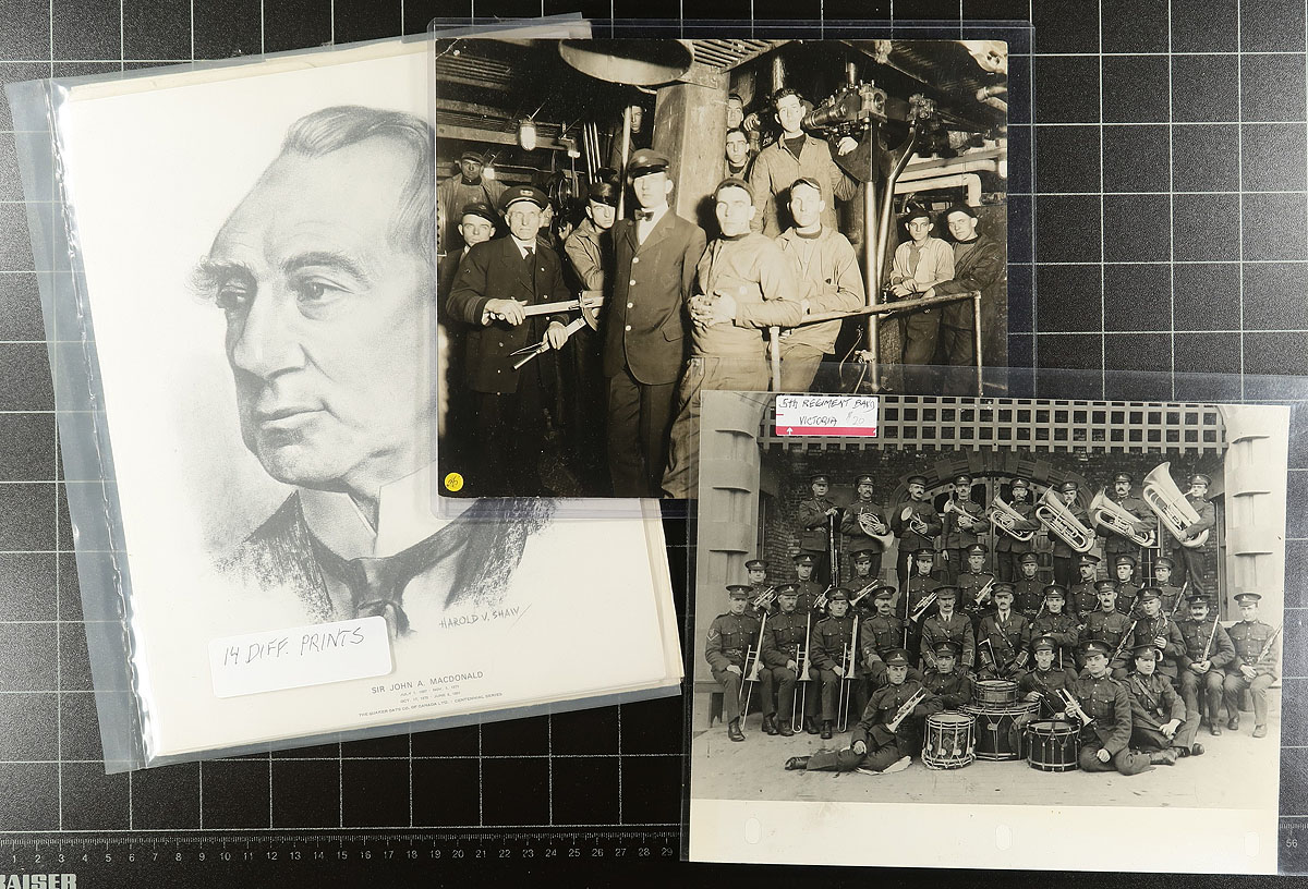 A "pizza box" of diverse mostly non-postal related ephemera, from a local estate. Includes (among other things), Prime Minister prints, several large photographs (including 5th Regiment Band WWI Victoria), Victoria BC "Tone Test Recital" programme (1921), Waldo BC 1923 School Roll of Honor certificate, letterheads, ship menus, photo negatives, early advertising cards, a stack of "Your Ideal Love Mate" cards (from an early amusement machine?), maps, greeting cards (AND MUCH MORE). Take a good look at the pictures to appreciate the scope of the group. Lots of value here if sorted out and individually sold. Estimate =