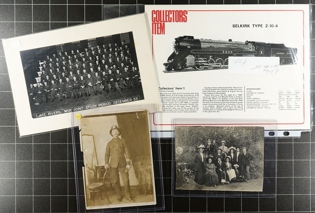 A "pizza box" of diverse mostly non-postal related ephemera, from a local estate. Includes (among other things), Prime Minister prints, several large photographs (including 5th Regiment Band WWI Victoria), Victoria BC "Tone Test Recital" programme (1921), Waldo BC 1923 School Roll of Honor certificate, letterheads, ship menus, photo negatives, early advertising cards, a stack of "Your Ideal Love Mate" cards (from an early amusement machine?), maps, greeting cards (AND MUCH MORE). Take a good look at the pictures to appreciate the scope of the group. Lots of value here if sorted out and individually sold. Estimate =