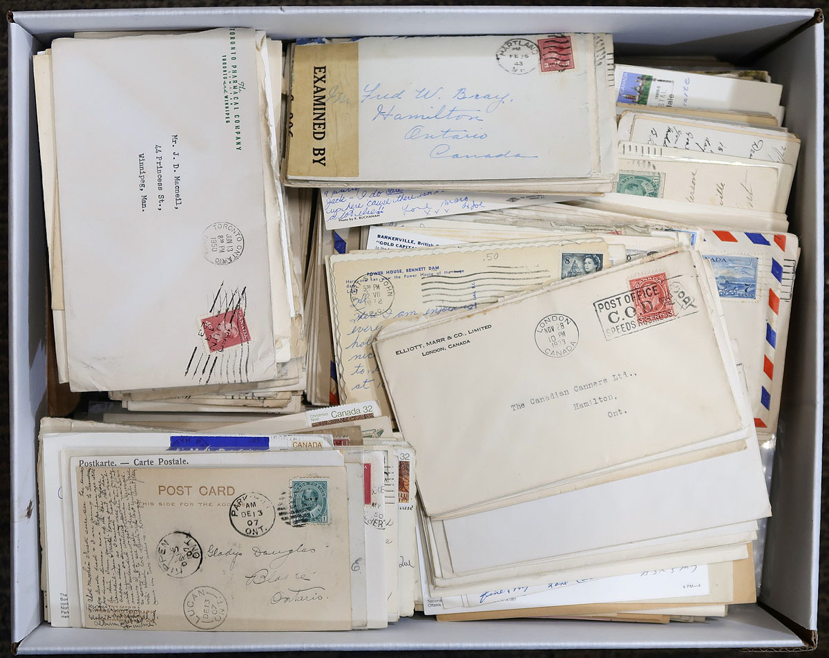 Bankers Box of Canadian Covers and Postcards. A catch-all from a local estate, which includes postmark interest, picture postcards, rates, postage due. Mostly commercial mail, but with some commemorative or philatelically inspired material mixed in as well. While don't expect any big-time items, there will be good fodder for sorting here, with likely over 1500 items. Perfect for a "Dollar Bin", with strength in the Edward to early QEII period. Estimate =