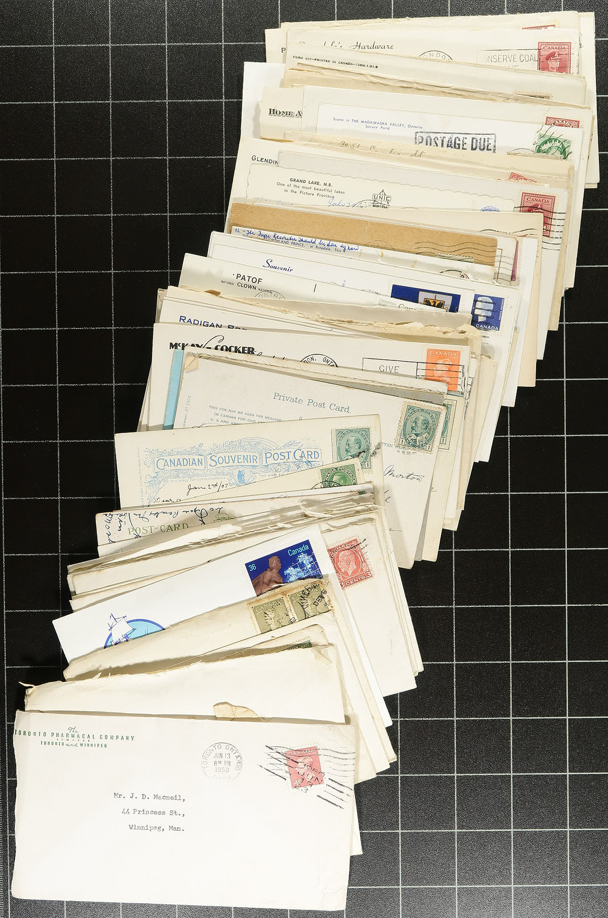 Bankers Box of Canadian Covers and Postcards. A catch-all from a local estate, which includes postmark interest, picture postcards, rates, postage due. Mostly commercial mail, but with some commemorative or philatelically inspired material mixed in as well. While don't expect any big-time items, there will be good fodder for sorting here, with likely over 1500 items. Perfect for a "Dollar Bin", with strength in the Edward to early QEII period. Estimate =