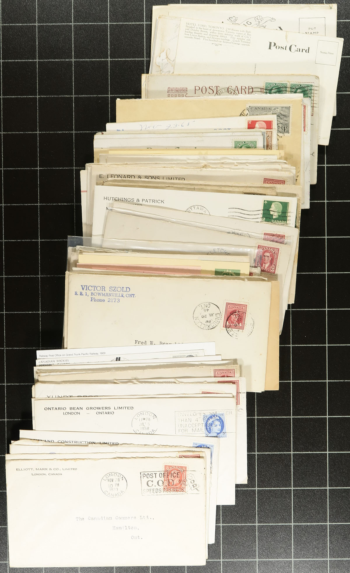 Bankers Box of Canadian Covers and Postcards. A catch-all from a local estate, which includes postmark interest, picture postcards, rates, postage due. Mostly commercial mail, but with some commemorative or philatelically inspired material mixed in as well. While don't expect any big-time items, there will be good fodder for sorting here, with likely over 1500 items. Perfect for a "Dollar Bin", with strength in the Edward to early QEII period. Estimate =