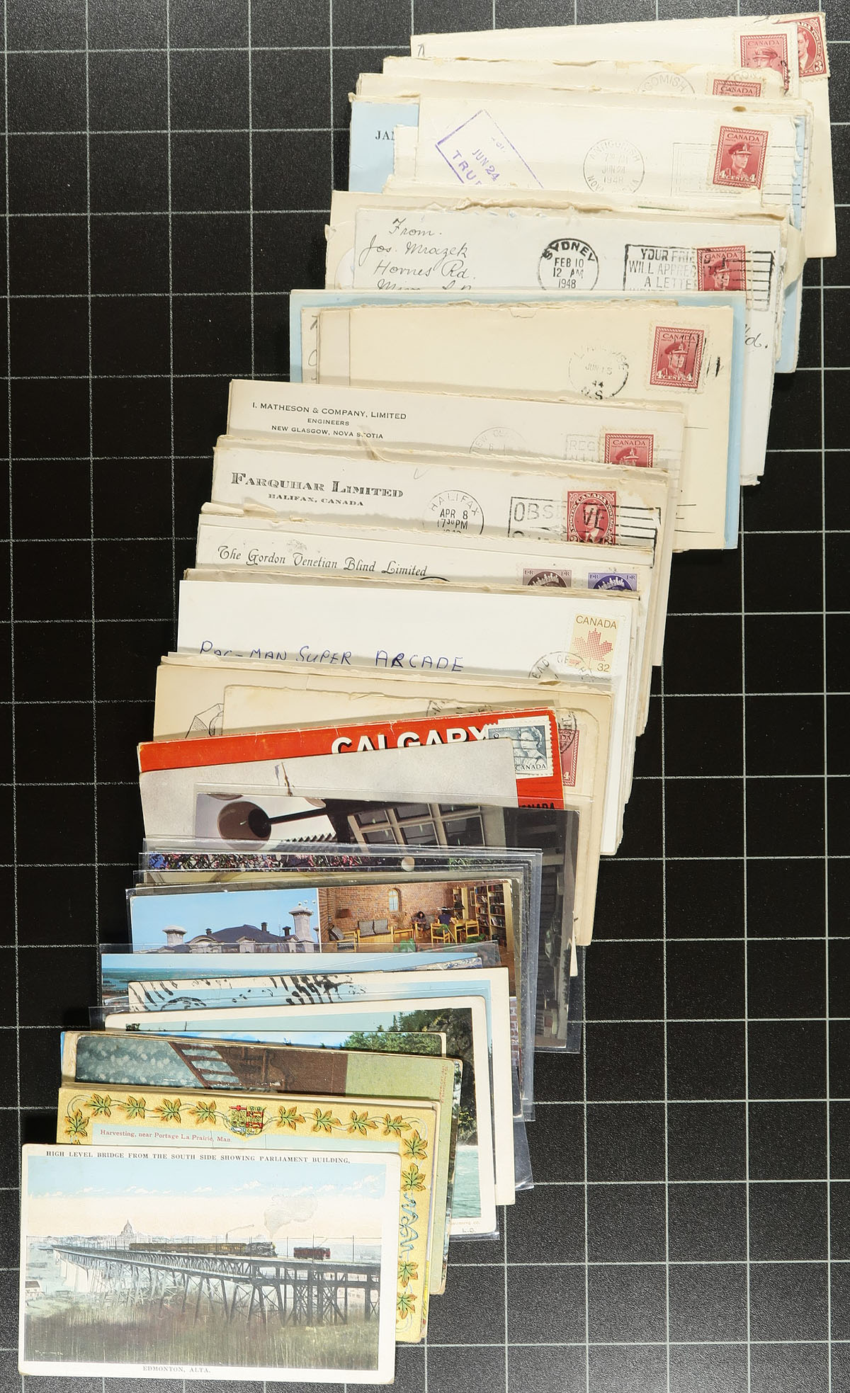 Bankers Box of Canadian Covers and Postcards. A second helping from a local estate, which includes postmark interest, picture postcards, rates, slogans, town cancels etc. Primarily commercial mail, with the odd philatelic item mixed in. An excellent sorter lot, and while there likely won't be any really valuable individual items here, there is just a lot of them (at least 1500 items) which would make perfect "Dollar Bin" fodder. Primarily Edward to early QEII period. Estimate =