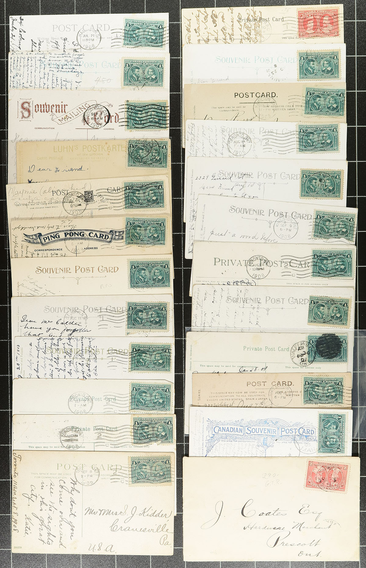 A collector's holding of 1908 Quebec Tercentenary franked covers and (mostly) postcards. A total of 147 items, mostly domestic usages from "Coast to Coast" and noted postmarks that include CDS, Split Ring, Duplex, Machine and RPO types. Condition on most is fair, with the odd small fault. We don't often see large batches of postal history with this specific series. Estimate =