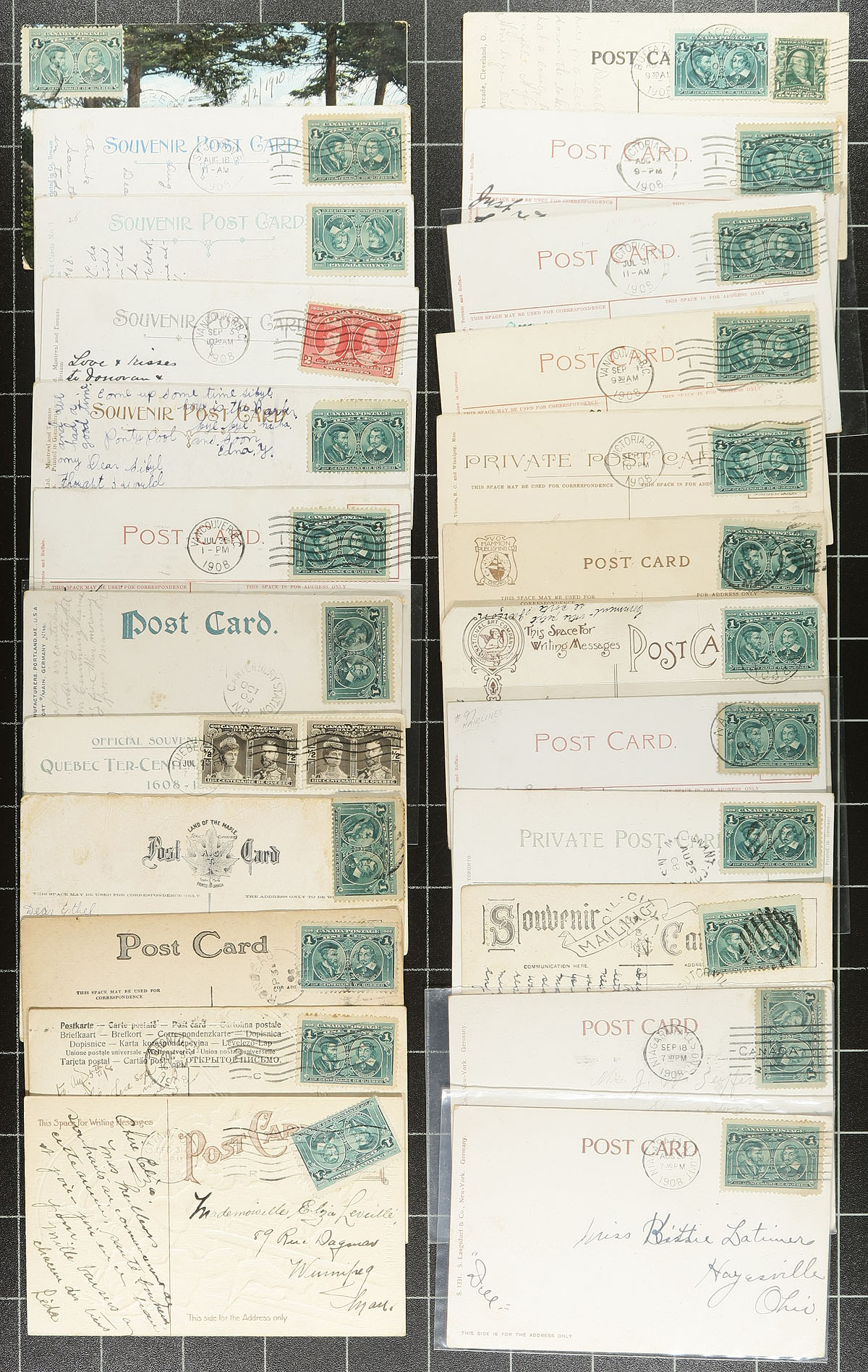 A collector's holding of 1908 Quebec Tercentenary franked covers and (mostly) postcards. A total of 147 items, mostly domestic usages from "Coast to Coast" and noted postmarks that include CDS, Split Ring, Duplex, Machine and RPO types. Condition on most is fair, with the odd small fault. We don't often see large batches of postal history with this specific series. Estimate =