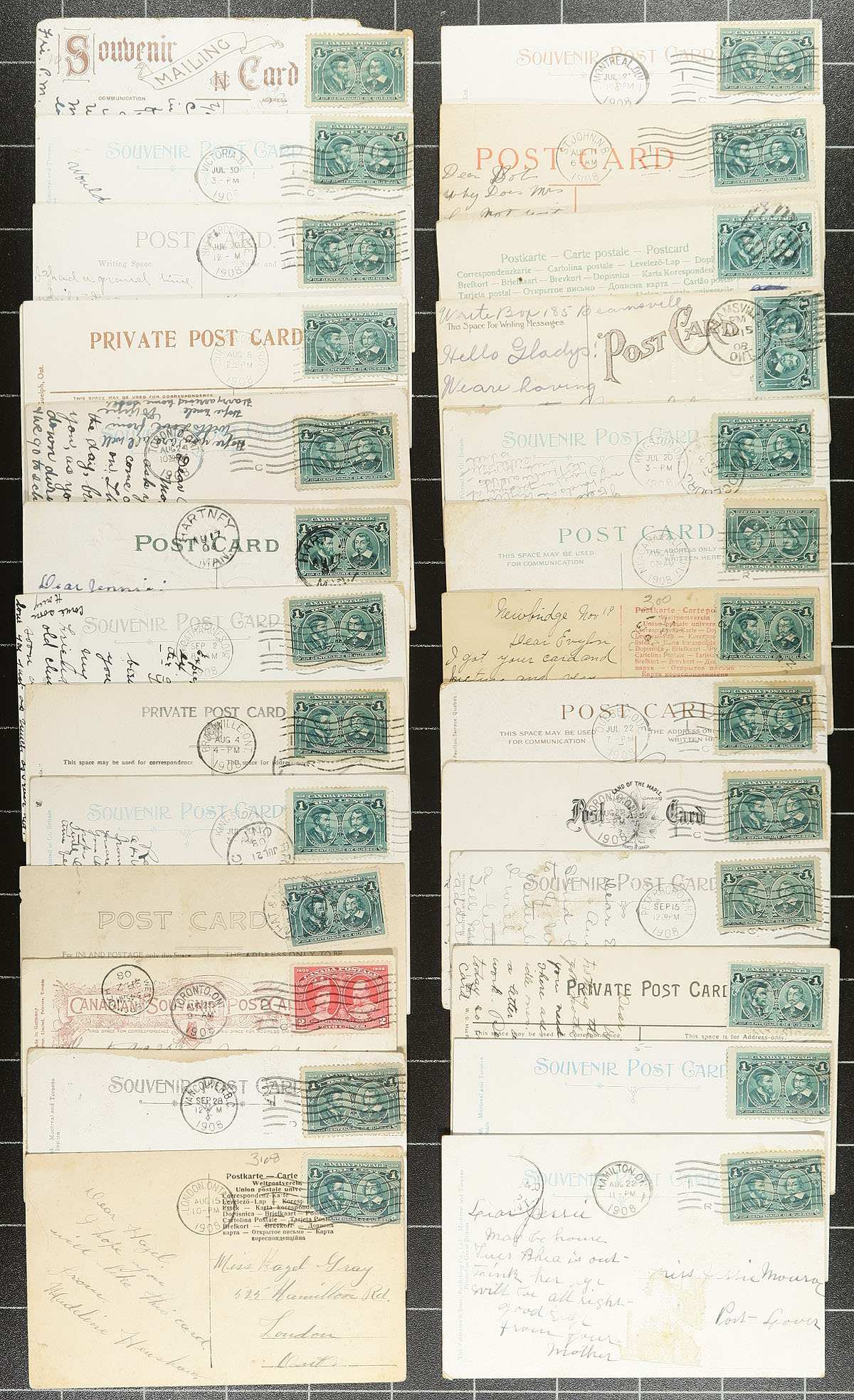 A collector's holding of 1908 Quebec Tercentenary franked covers and (mostly) postcards. A total of 147 items, mostly domestic usages from "Coast to Coast" and noted postmarks that include CDS, Split Ring, Duplex, Machine and RPO types. Condition on most is fair, with the odd small fault. We don't often see large batches of postal history with this specific series. Estimate =