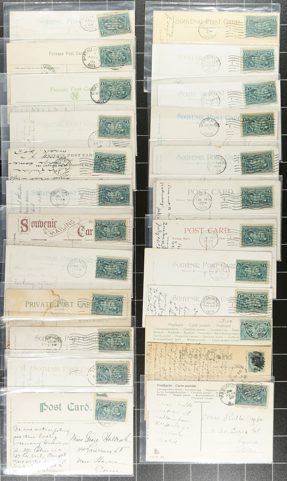 A collector's holding of 1908 Quebec Tercentenary franked covers and (mostly) postcards. A total of 147 items, mostly domestic usages from "Coast to Coast" and noted postmarks that include CDS, Split Ring, Duplex, Machine and RPO types. Condition on most is fair, with the odd small fault. We don't often see large batches of postal history with this specific series. Estimate =