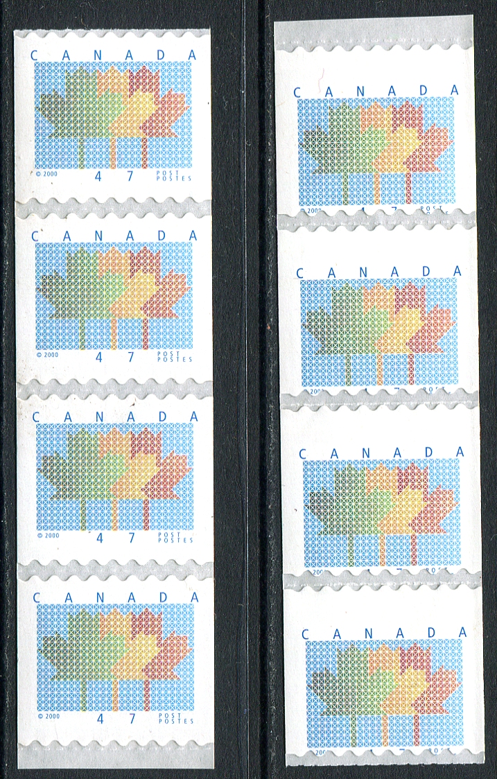 VF mint self-adhesive strip of four of the 2000 issued "Stylized Maple Leaf" 46c coil, with major shift, almost eliminating the 47c value from each stamp. Accompanied by as regular strip of four for comparison. Modern misperfs are much harder to find. Estimate =