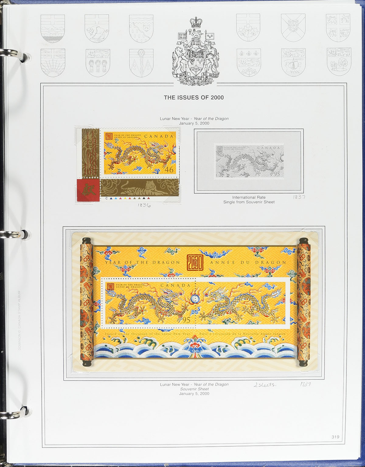 Modern Mint Never Hinged Collection 1994-2004 within a padded "Dominion of Canada" stamp album. An attractive "one of each" collection, including souvenir sheets, $8.00 Grizzly, complete booklets, panes, 2000 Millenium panes and a smattering of complimentary used and FDC. Very clean material, conservatively valued for the total usable postage value only. Total face value =