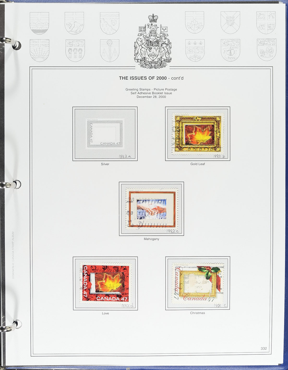 Modern Mint Never Hinged Collection 1994-2004 within a padded "Dominion of Canada" stamp album. An attractive "one of each" collection, including souvenir sheets, $8.00 Grizzly, complete booklets, panes, 2000 Millenium panes and a smattering of complimentary used and FDC. Very clean material, conservatively valued for the total usable postage value only. Total face value =