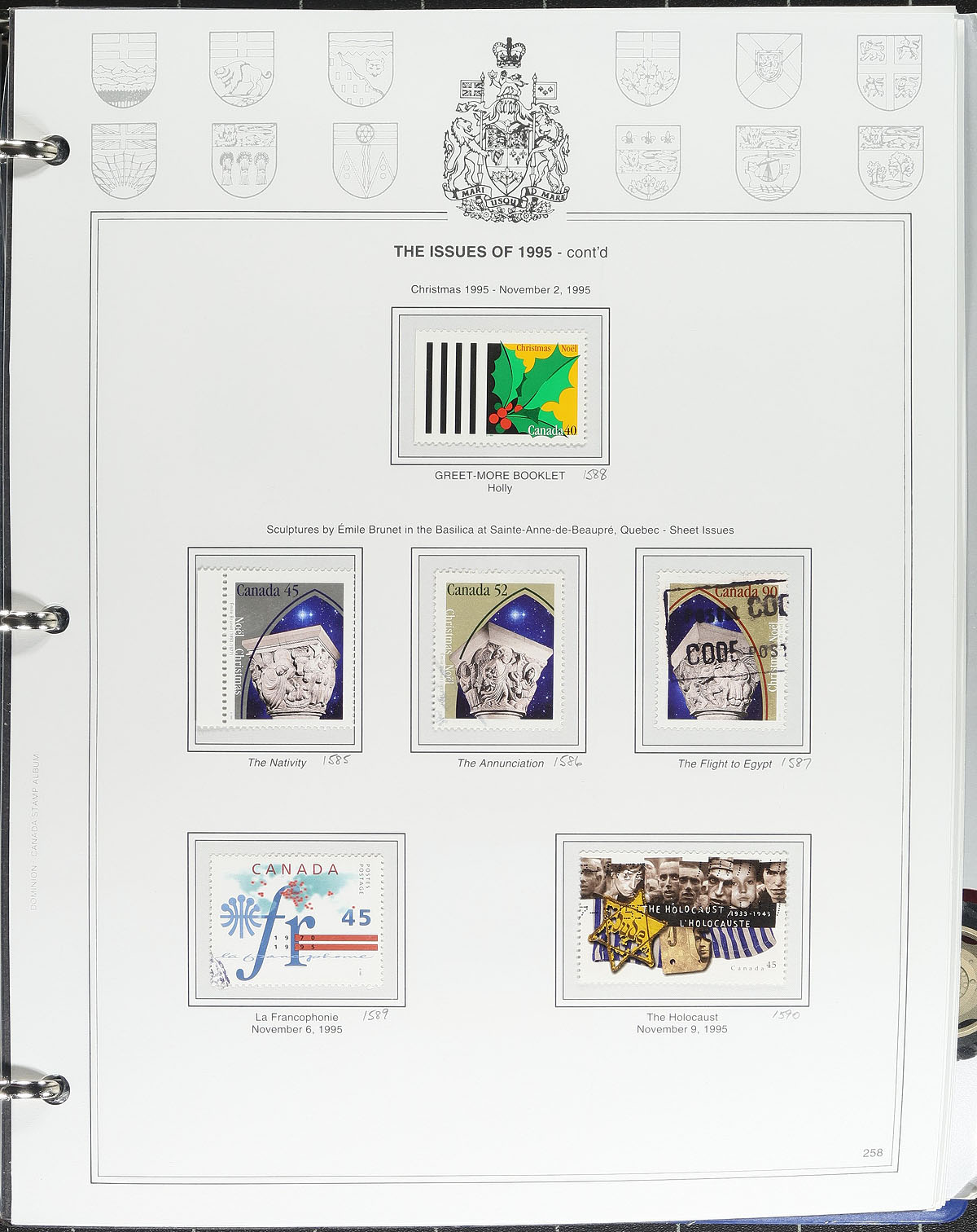 Modern Mint Never Hinged Collection 1994-2004 within a padded "Dominion of Canada" stamp album. An attractive "one of each" collection, including souvenir sheets, $8.00 Grizzly, complete booklets, panes, 2000 Millenium panes and a smattering of complimentary used and FDC. Very clean material, conservatively valued for the total usable postage value only. Total face value =