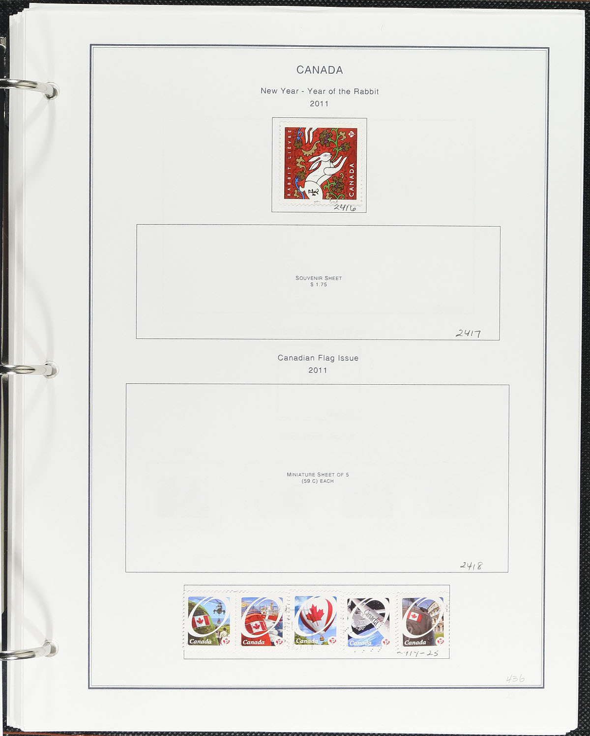 Modern Mint Never Hinged Collection 2005-2012 arranged on computer generated pages with a deluxe 3-ring binder. A mix of both mint and used, with the odd FDC mixed in as well. A variety of formats including singles, souvenir sheets, coils and die-cuts. Very clean material, that has conservatively been value for the total usable postage value only. Total face value =