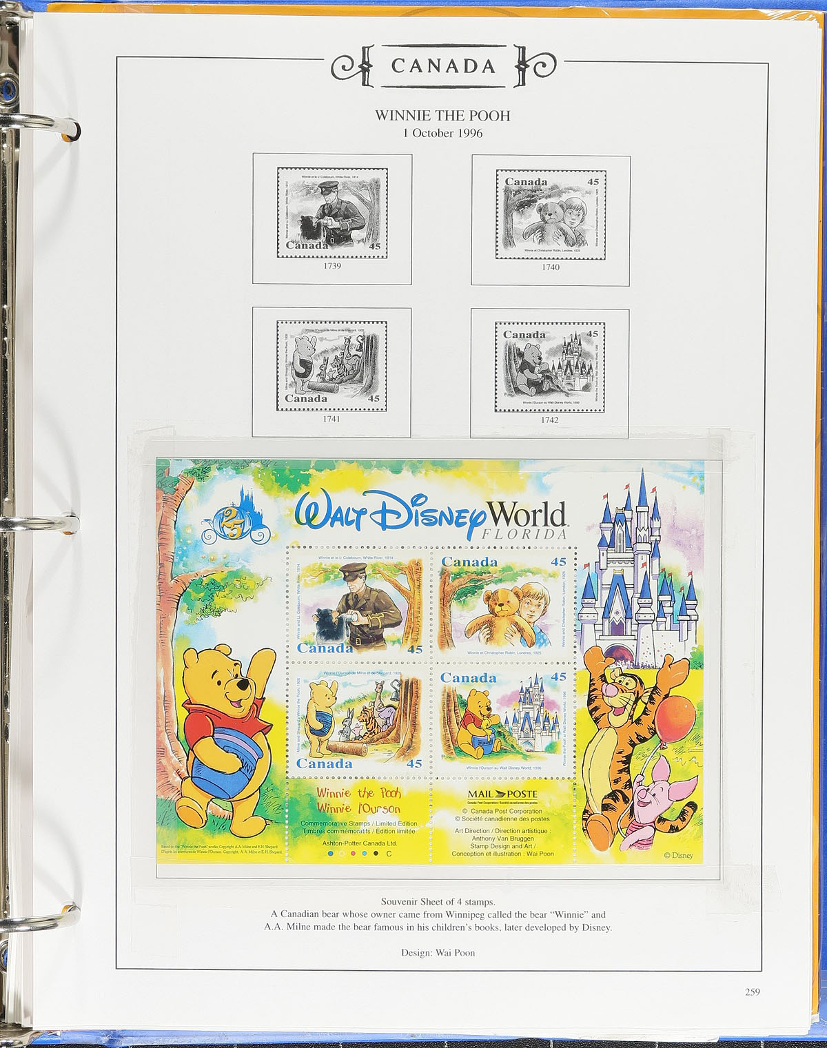 Modern Mint Never Hinged Collection 1988-1998 within a padded "Dominion of Canada" stamp album. An attractive "one of each" collection, including compete booklets, $8.00 Grizzly, complete booklets, panes, 1990 Petro Canada sheetlets and a smattering of complimentary used and FDC. Very clean material, conservatively valued for the total usable postage value only. Total face value =