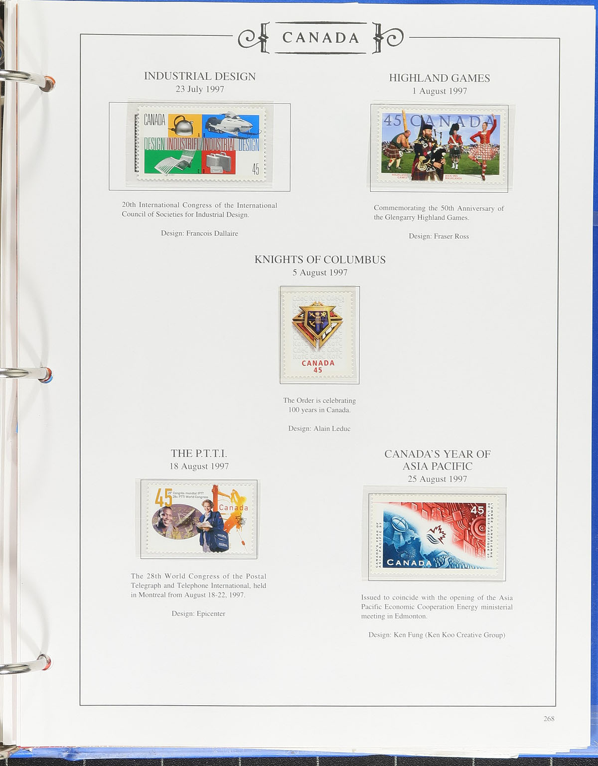 Modern Mint Never Hinged Collection 1988-1998 within a padded "Dominion of Canada" stamp album. An attractive "one of each" collection, including compete booklets, $8.00 Grizzly, complete booklets, panes, 1990 Petro Canada sheetlets and a smattering of complimentary used and FDC. Very clean material, conservatively valued for the total usable postage value only. Total face value =