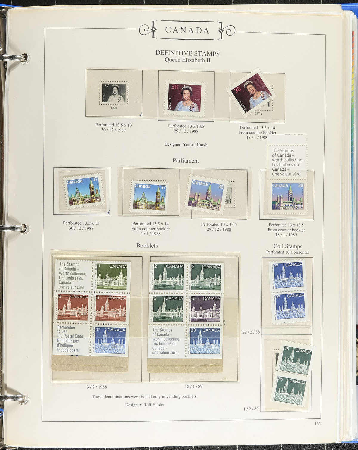 Modern Mint Never Hinged Collection 1988-1998 within a padded "Dominion of Canada" stamp album. An attractive "one of each" collection, including compete booklets, $8.00 Grizzly, complete booklets, panes, 1990 Petro Canada sheetlets and a smattering of complimentary used and FDC. Very clean material, conservatively valued for the total usable postage value only. Total face value =