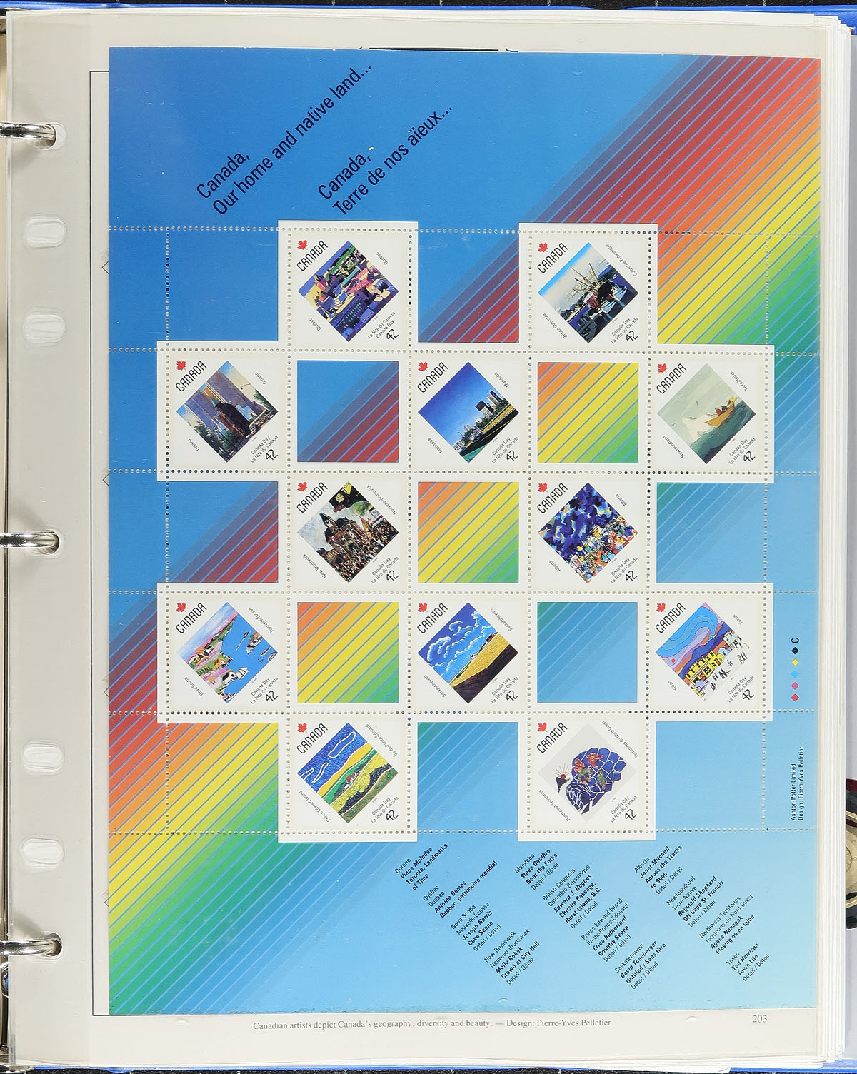 Modern Mint Never Hinged Collection 1988-1998 within a padded "Dominion of Canada" stamp album. An attractive "one of each" collection, including compete booklets, $8.00 Grizzly, complete booklets, panes, 1990 Petro Canada sheetlets and a smattering of complimentary used and FDC. Very clean material, conservatively valued for the total usable postage value only. Total face value =