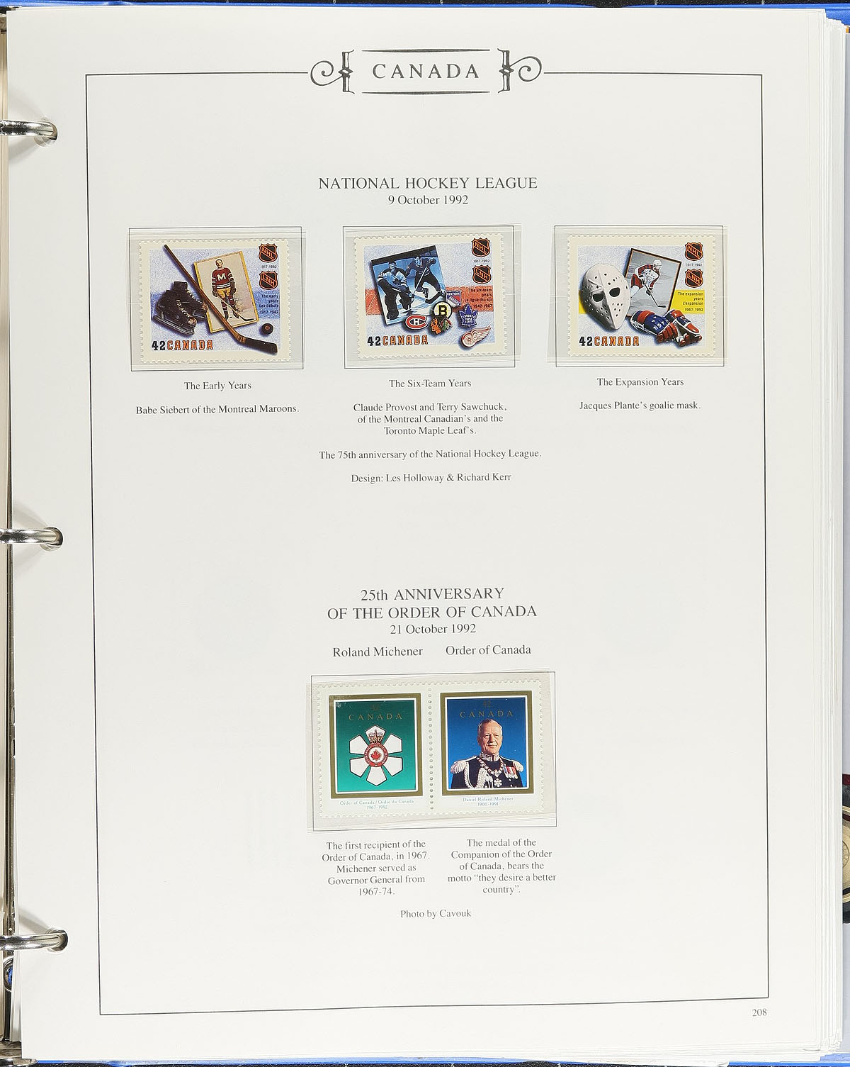 Modern Mint Never Hinged Collection 1988-1998 within a padded "Dominion of Canada" stamp album. An attractive "one of each" collection, including compete booklets, $8.00 Grizzly, complete booklets, panes, 1990 Petro Canada sheetlets and a smattering of complimentary used and FDC. Very clean material, conservatively valued for the total usable postage value only. Total face value =