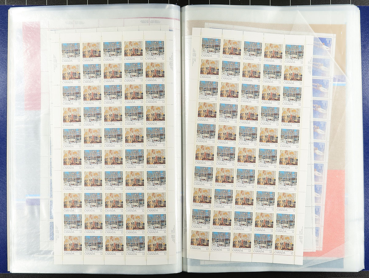 Mint Sheet Holding. A mint sheet album (with slipcase) containing 29 complete mint Never Hinged panes for the 1975-1981 period (with one "odd duck", the 1947 Alexander Graham Bell issue). Clean material, often with the Post Office advertising sheet from when sealed in plastic. Conservatively value for the total usable potage value only. Total face value =