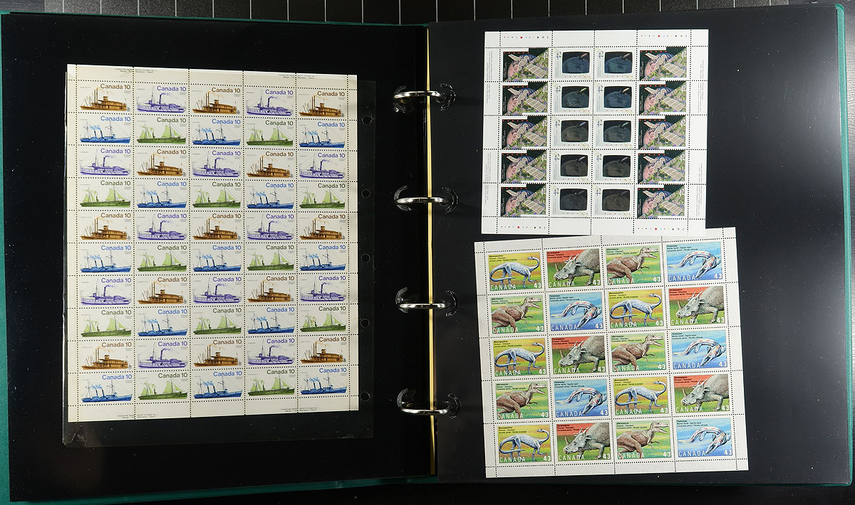 Mint Sheet Holding. A deluxe green Unisafe sheet album (with matching slipcase) containing a wild array of mint sheets from the late George VI to early 2000's, with a small smattering of plate blocks at the back. Seemingly no rhyme or reason here, but we noted sheets for the 1952 Red Cross, 1957 Mining, 1970 EXPO Japan, 1977 QEII Silver Jubilee and MANY others. Clean material, conservatively valued for the total usable postage only (but keep in mind this album and pages is likely $75++). Included (but not counted) is the French version sheet from the dual issue 1984 Jacques Cartier series. Total face value =