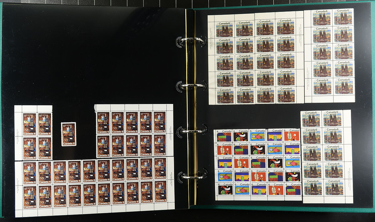 Mint Sheet Holding. A deluxe green Unisafe sheet album (with matching slipcase) containing a wild array of mint sheets from the late George VI to early 2000's, with a small smattering of plate blocks at the back. Seemingly no rhyme or reason here, but we noted sheets for the 1952 Red Cross, 1957 Mining, 1970 EXPO Japan, 1977 QEII Silver Jubilee and MANY others. Clean material, conservatively valued for the total usable postage only (but keep in mind this album and pages is likely $75++). Included (but not counted) is the French version sheet from the dual issue 1984 Jacques Cartier series. Total face value =