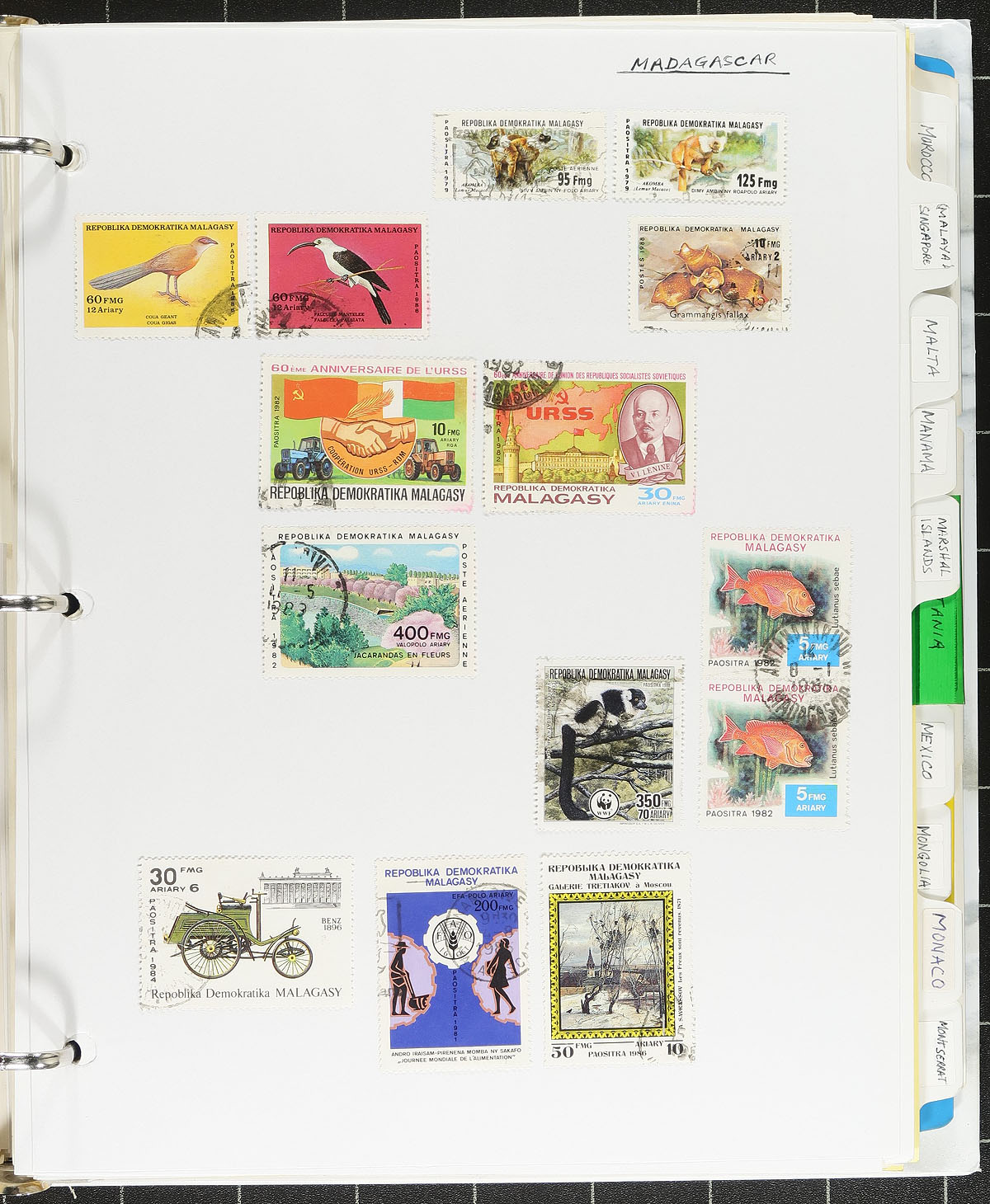 Outstanding mostly used collection of "one of each" as assembled by a lifetime hobbyist, that started collecting worldwide stamps as a child and continued on for 70+ years, collecting for the pure passion of obtaining as many worldwide stamps as possible. Arrange on home-made pages within 7 matching "marble" binders, there is a total of 13,258 stamps here (yes, we counted them), with strength in Canada / USA and Great Britain, but also a fair showing of many other countries, just to lesser extents. While there might not be many $10.00+ stamps here, the value is in the sheer quantity of all-different issues, with a very clean offering of many countries, which can run from earlier issues up to about 2005. A fun lot to sort through. Estimate =