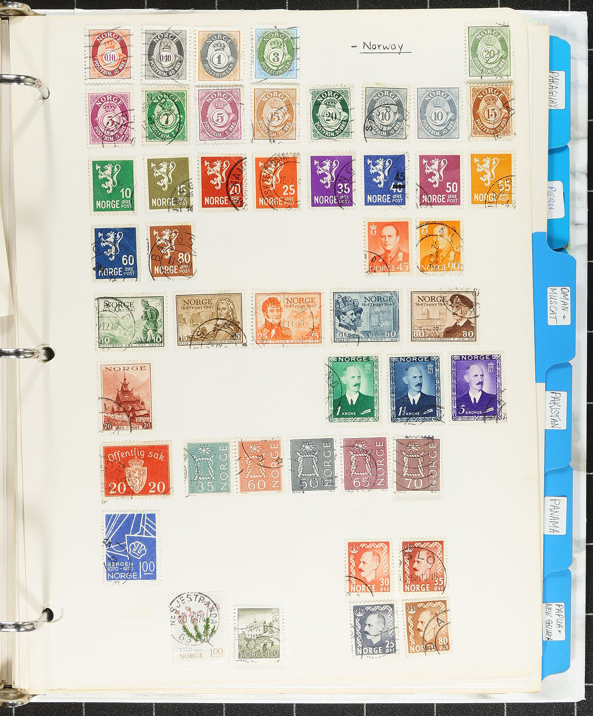 Outstanding mostly used collection of "one of each" as assembled by a lifetime hobbyist, that started collecting worldwide stamps as a child and continued on for 70+ years, collecting for the pure passion of obtaining as many worldwide stamps as possible. Arrange on home-made pages within 7 matching "marble" binders, there is a total of 13,258 stamps here (yes, we counted them), with strength in Canada / USA and Great Britain, but also a fair showing of many other countries, just to lesser extents. While there might not be many $10.00+ stamps here, the value is in the sheer quantity of all-different issues, with a very clean offering of many countries, which can run from earlier issues up to about 2005. A fun lot to sort through. Estimate =