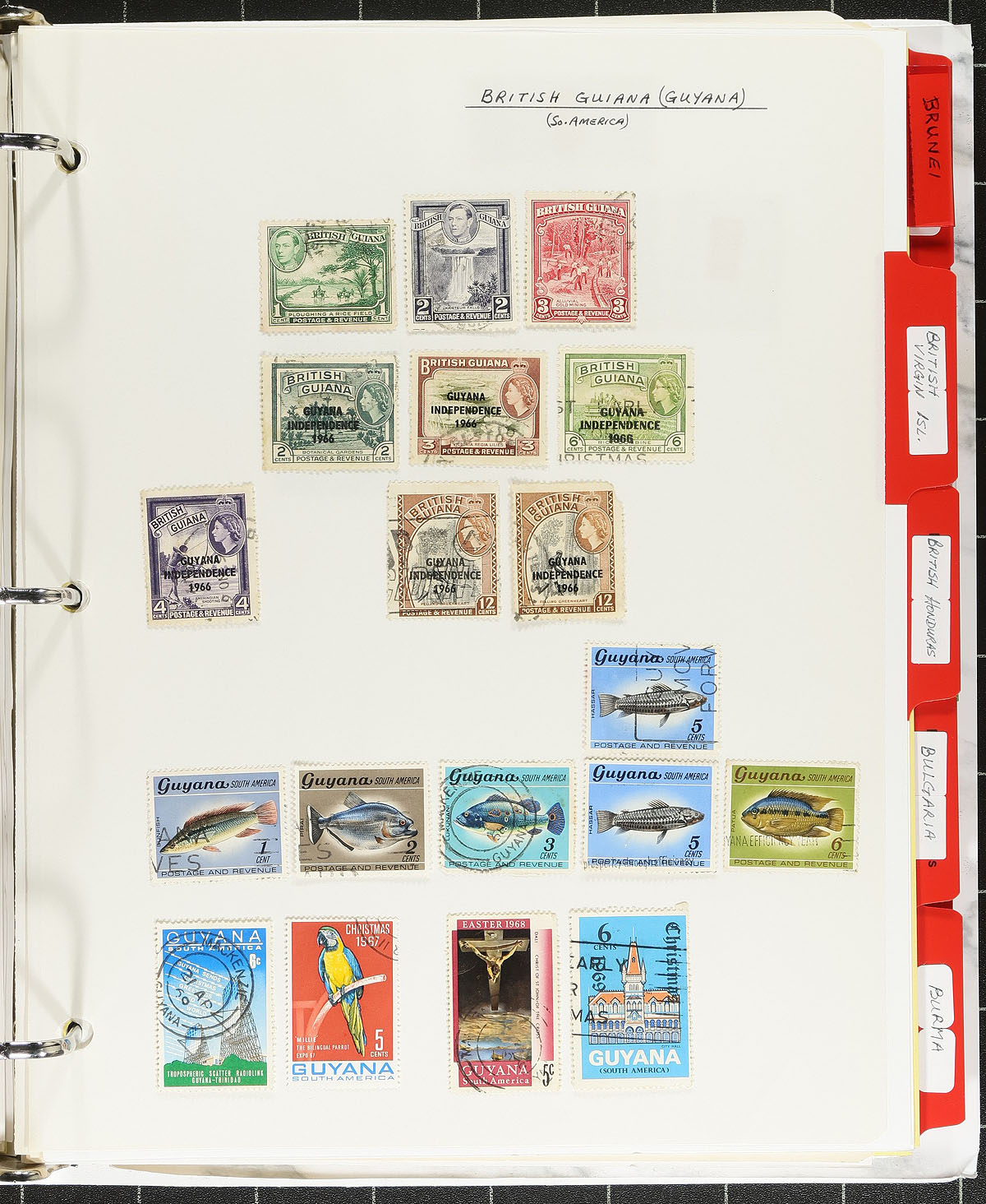 Outstanding mostly used collection of "one of each" as assembled by a lifetime hobbyist, that started collecting worldwide stamps as a child and continued on for 70+ years, collecting for the pure passion of obtaining as many worldwide stamps as possible. Arrange on home-made pages within 7 matching "marble" binders, there is a total of 13,258 stamps here (yes, we counted them), with strength in Canada / USA and Great Britain, but also a fair showing of many other countries, just to lesser extents. While there might not be many $10.00+ stamps here, the value is in the sheer quantity of all-different issues, with a very clean offering of many countries, which can run from earlier issues up to about 2005. A fun lot to sort through. Estimate =