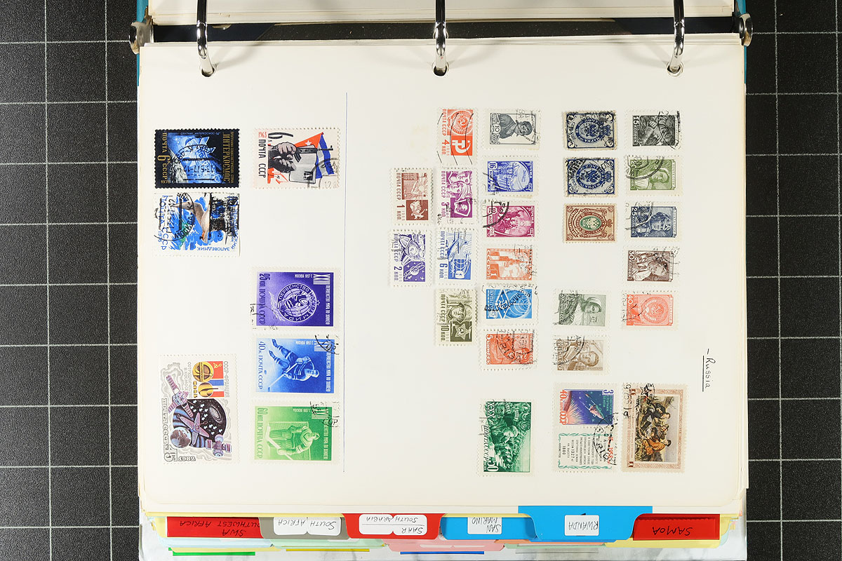 Outstanding mostly used collection of "one of each" as assembled by a lifetime hobbyist, that started collecting worldwide stamps as a child and continued on for 70+ years, collecting for the pure passion of obtaining as many worldwide stamps as possible. Arrange on home-made pages within 7 matching "marble" binders, there is a total of 13,258 stamps here (yes, we counted them), with strength in Canada / USA and Great Britain, but also a fair showing of many other countries, just to lesser extents. While there might not be many $10.00+ stamps here, the value is in the sheer quantity of all-different issues, with a very clean offering of many countries, which can run from earlier issues up to about 2005. A fun lot to sort through. Estimate =