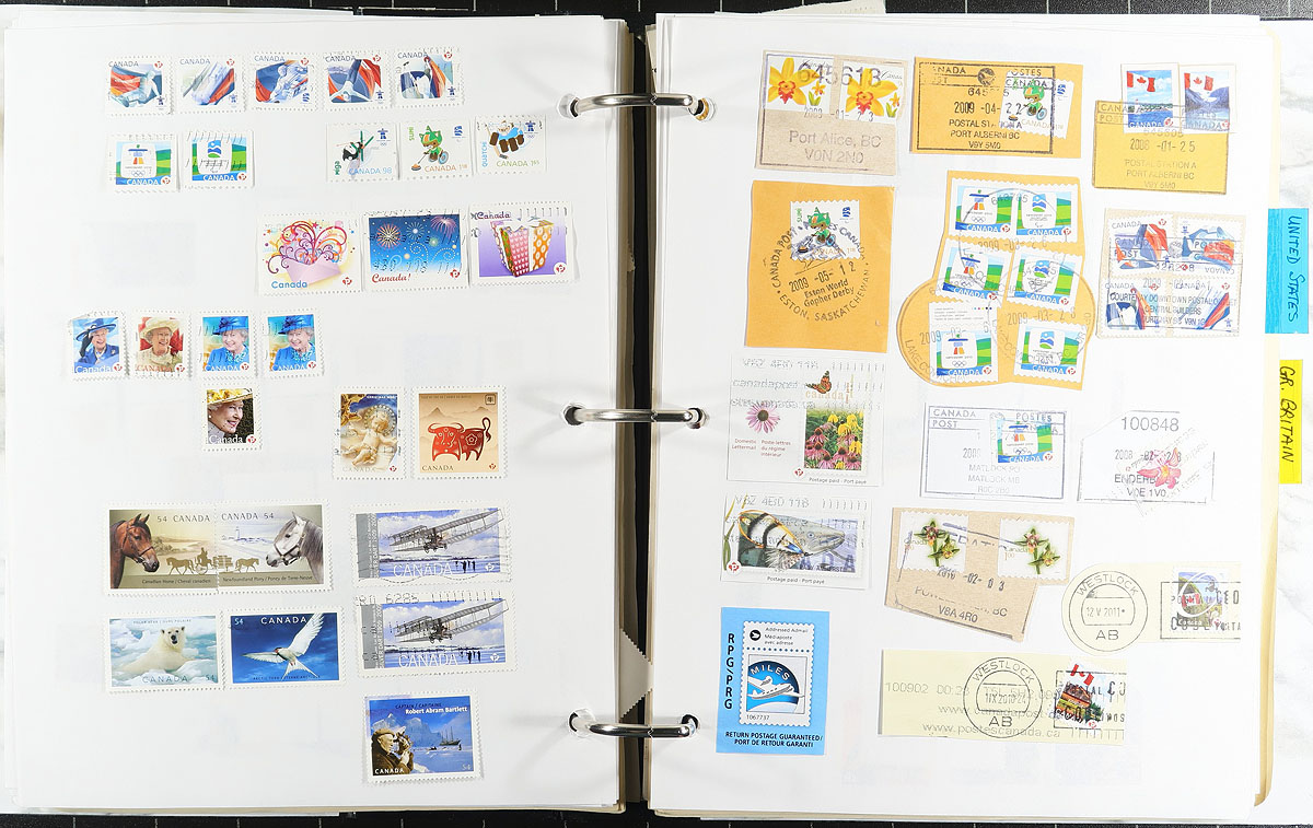 Outstanding mostly used collection of "one of each" as assembled by a lifetime hobbyist, that started collecting worldwide stamps as a child and continued on for 70+ years, collecting for the pure passion of obtaining as many worldwide stamps as possible. Arrange on home-made pages within 7 matching "marble" binders, there is a total of 13,258 stamps here (yes, we counted them), with strength in Canada / USA and Great Britain, but also a fair showing of many other countries, just to lesser extents. While there might not be many $10.00+ stamps here, the value is in the sheer quantity of all-different issues, with a very clean offering of many countries, which can run from earlier issues up to about 2005. A fun lot to sort through. Estimate =