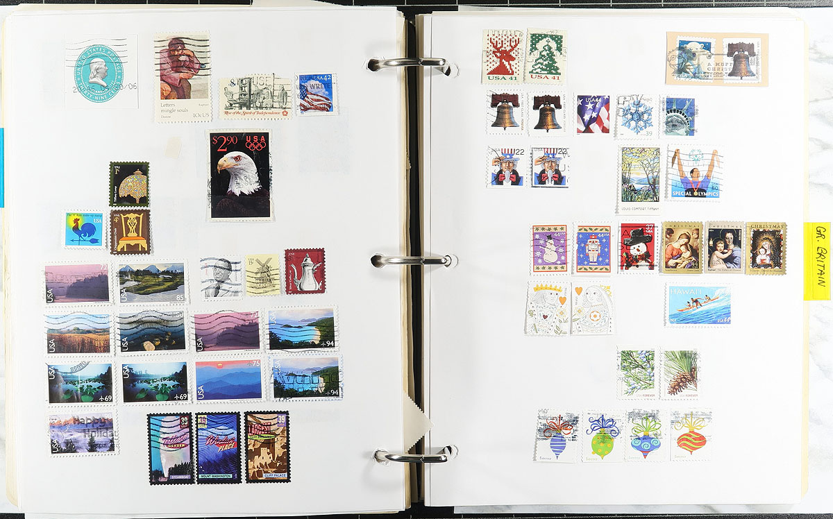 Outstanding mostly used collection of "one of each" as assembled by a lifetime hobbyist, that started collecting worldwide stamps as a child and continued on for 70+ years, collecting for the pure passion of obtaining as many worldwide stamps as possible. Arrange on home-made pages within 7 matching "marble" binders, there is a total of 13,258 stamps here (yes, we counted them), with strength in Canada / USA and Great Britain, but also a fair showing of many other countries, just to lesser extents. While there might not be many $10.00+ stamps here, the value is in the sheer quantity of all-different issues, with a very clean offering of many countries, which can run from earlier issues up to about 2005. A fun lot to sort through. Estimate =