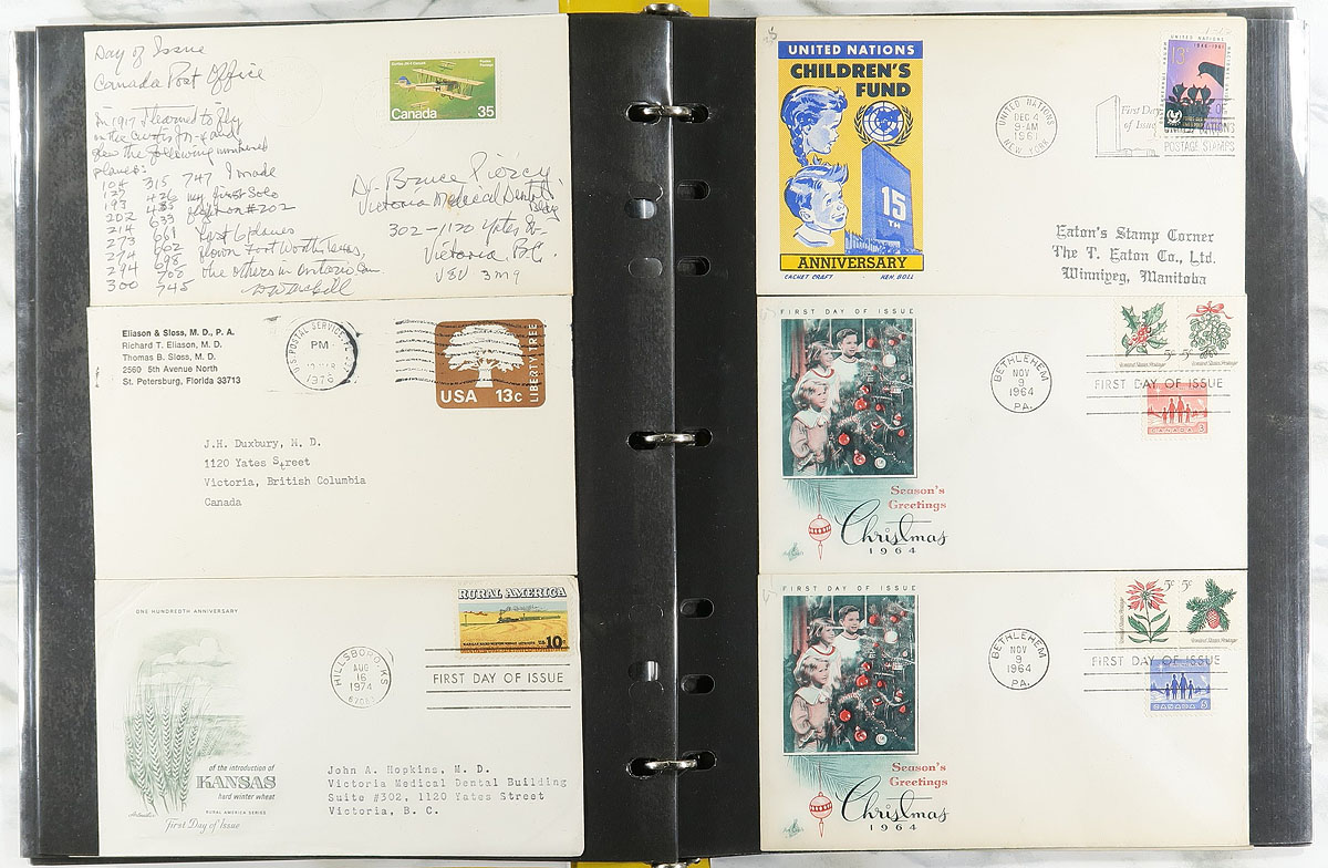 Outstanding mostly used collection of "one of each" as assembled by a lifetime hobbyist, that started collecting worldwide stamps as a child and continued on for 70+ years, collecting for the pure passion of obtaining as many worldwide stamps as possible. Arrange on home-made pages within 7 matching "marble" binders, there is a total of 13,258 stamps here (yes, we counted them), with strength in Canada / USA and Great Britain, but also a fair showing of many other countries, just to lesser extents. While there might not be many $10.00+ stamps here, the value is in the sheer quantity of all-different issues, with a very clean offering of many countries, which can run from earlier issues up to about 2005. A fun lot to sort through. Estimate =