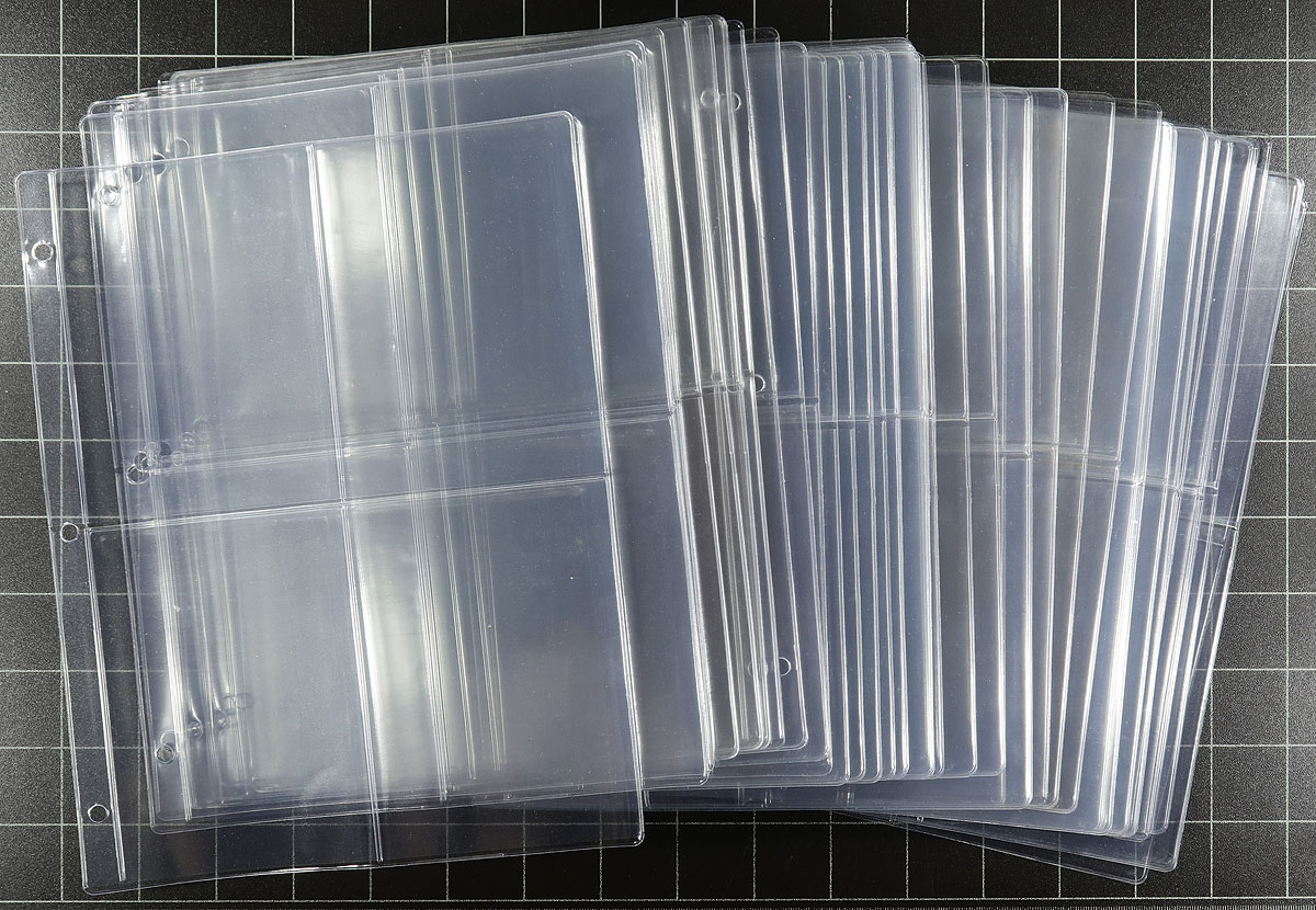 Lightly used group of 4-pocket clean pages, with standard 3-hole punch configuration to fit any standard binder. Group of 150 pages, which were used by the previous owner to house postcards (which stuck out the top slightly). Very useful for mint blocks, or anything you would want to potentially view both sides of with ease. All neatly packed into a small box. These are more heavy-duty than the majority we see, with original cost on these pages being over $1.00 per page. Estimate =