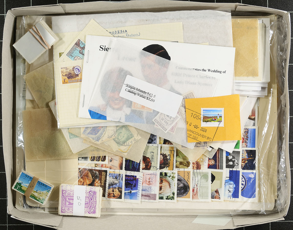 TREASURE BOX! As received from England, a 2.5 lb. box loaded with goodies! Note used set of Canada Millennium issue (Unitrade 102.00); Over £50 face mint GB decimal currency with Royal Mail 'swap-out' forms for new bar-coded postage; Bunch of BC Law Revenues with better including pin perfs & documents; Baggie with Brazil-could be something good in there; Germany #62-65 & C38-C45 mint NH excellent 'REPRINTS' (includes interesting story) 2025 Scott 12,700 USA$ if legit; Glassines with mint New Zealand; Bundle of #102 cards with duplicated North Korea; many mint & used souvenir sheets; many glassines & #102 cards with sets & high values; etc. etc. Loaded with good stuff & sure to please! Estimate =