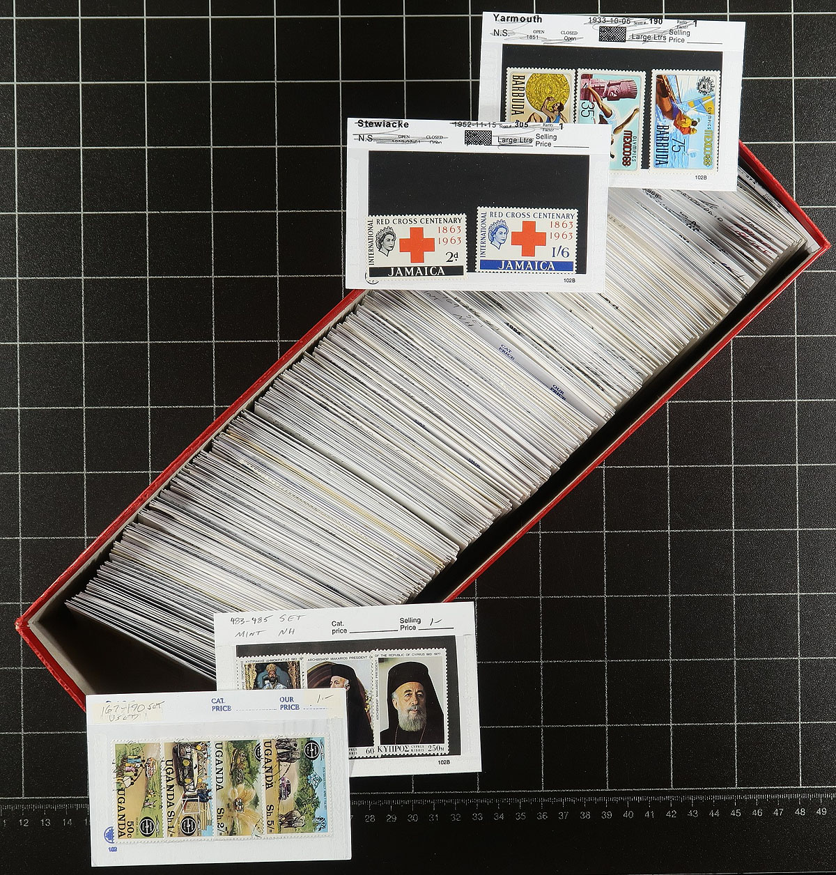 Holding of 600+ sets & singles on #102 cards housed in a long red sales box. Every card in the box is priced at 1.00 each, although most items catalogue well over 1.00 each. Set up for a bourse dealer, all he has to do is take the cover off the box! Many mint sets, mostly good easy saleable countries, only the very odd CTO item! Estimate =