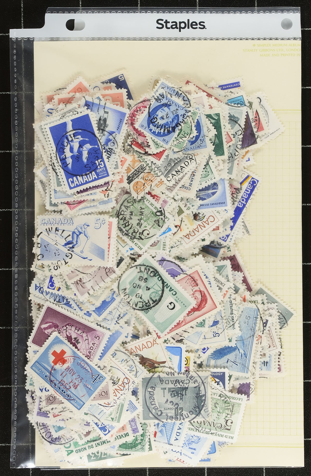 Selection of 700+ "socked-on-the-nose" CDS cancels on 1950's-1960's stamps, from across Canada. Unsorted from a specialist. We don't often get large groups of these, with many select strikes! Estimate =