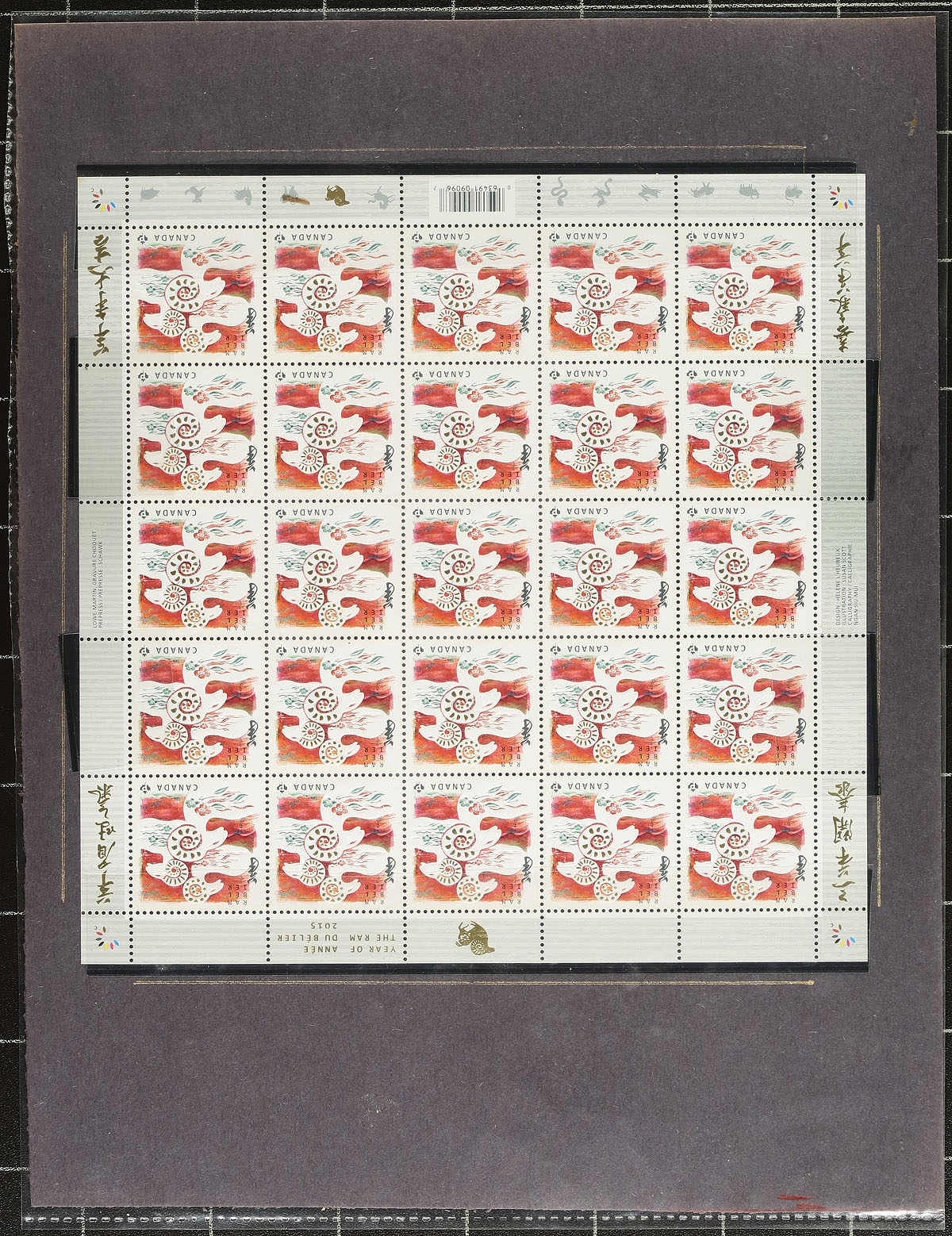 Lovely collection of primarily mint never hinged "Lunar New Year- Year of the Ram", January 2015, covering Unitrade #s 2801-2803, all in hingeless mounts in 18 well described pages. The collection contains mint and used singles (including booklet stamps), 2 mint sheets, matched set of mint plate blocks, mint and used souvenir sheets, booklets, and a few first day covers. Face value alone totals $162 (including 81x "P" value stamps). A lovely collection for any Canada collector. 2024 Unitrade =